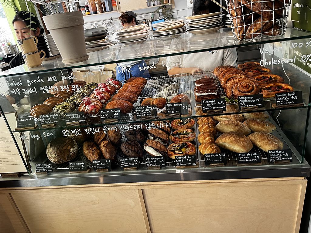 I often wonder how everyone has different experiences when it comes to experience the same food or pastry prepared by the same chef or baker. I understand I should never have to compare “orange vs apple” hmm Today I arrived around 5:45 pm and most baked goods were long gone, so I settled with a tiny fig croissant 🥐 (keep in mind that yesterday I was in the BEST vegan croissant 🥐 bakery/cafe of South Korea in Busan) and now this croissant at URT in Seoul was 1/2 size of the other and not even 1/4 delicious and satisfying near the other. I am staying true to myself even I might be offending many other reviewers/customers. But no, I had way better vegan croissants with doubled the sizes (&crazy impressive delicious cream fillings) than what they offered here. Plus, 2000 wons more expensive than the one in Busan. Namaste!