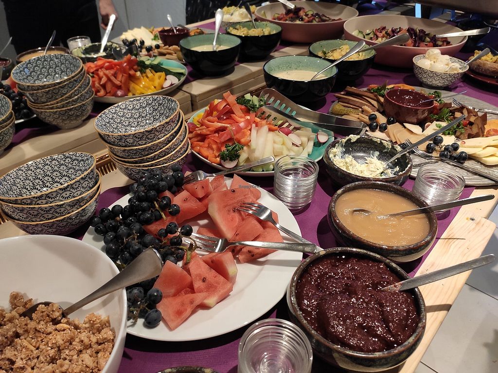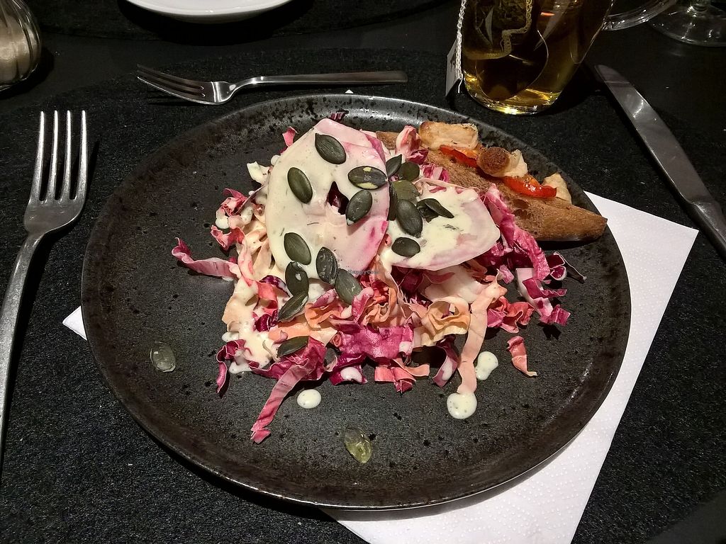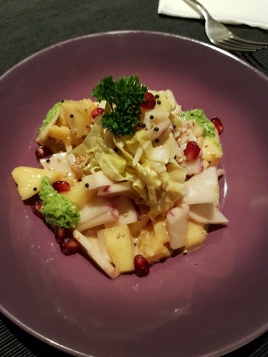 Chicorée, Erdnusssauce, Trauben & Reiscracker