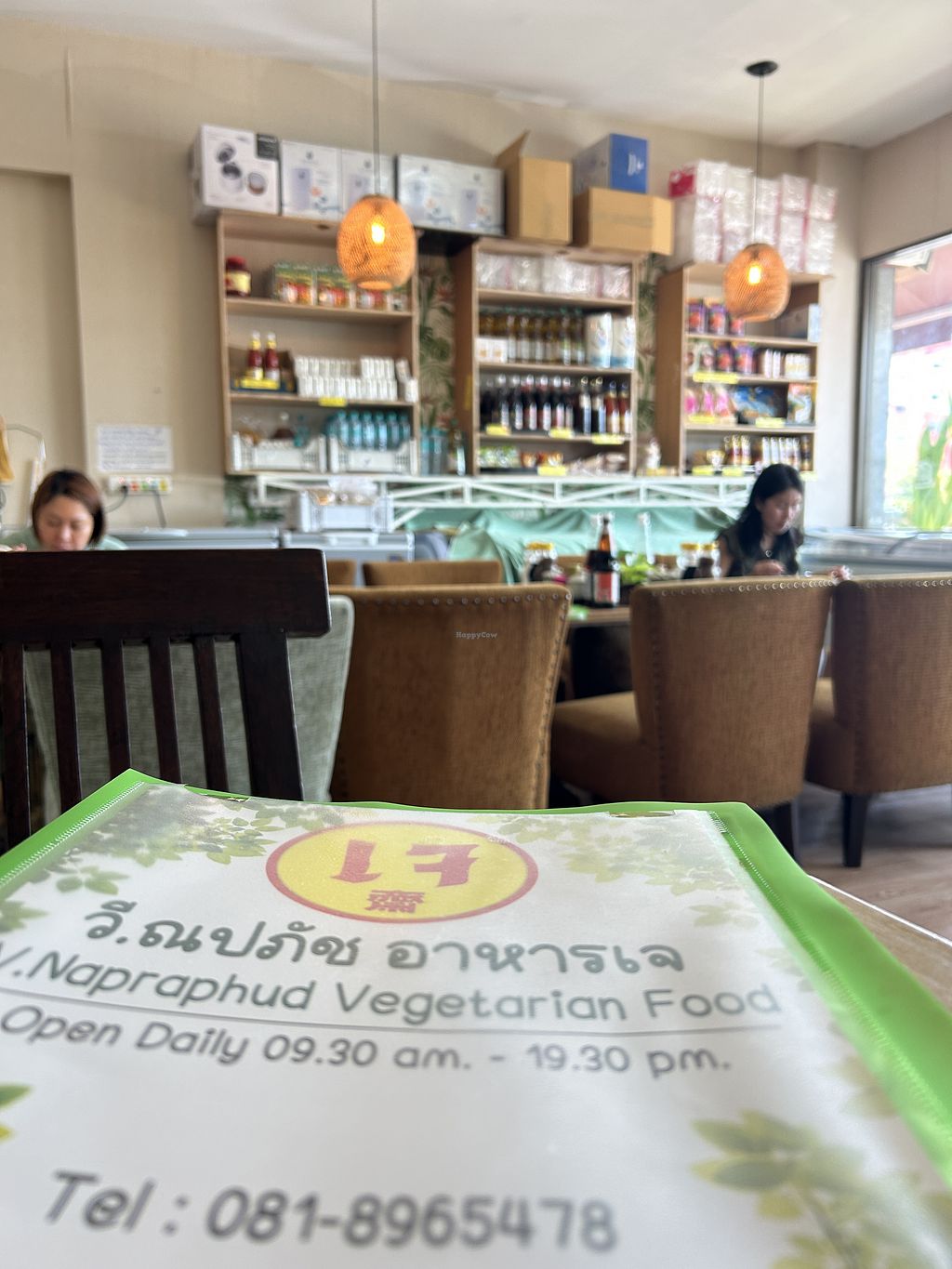 Simple premises with a couple of tables out the front veranda that overlooks the carpark - not very atmospheric. There's more seating inside but it feels a little bit cluttered with shelves of packaged groceries around the walls and large freezer of mock, dumplings, etc along the front window. The menu looked varied with reasonable prices. I ordered spicy Northern Thai style sausage for 70 THB. In the picture it was the big coiled kind with a salad on the side but when it arrived it was barely an appetizer - about 6 slices of sausage with about 3 lettuce leaves and a couple of slices of cucumber. Lol! It was a delicious snack but I was looking for lunch. I think there are better value, more filling items on the menu though.