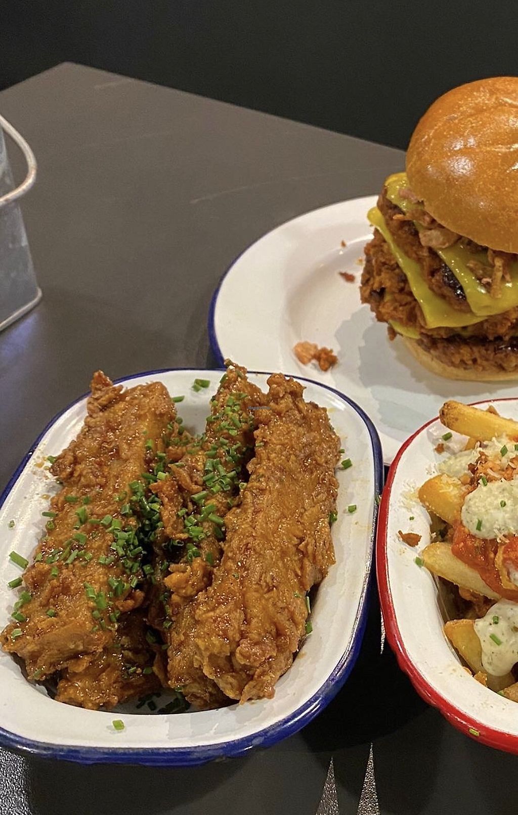Babecute burger, fries, mac n cheeze and chicken wingz
