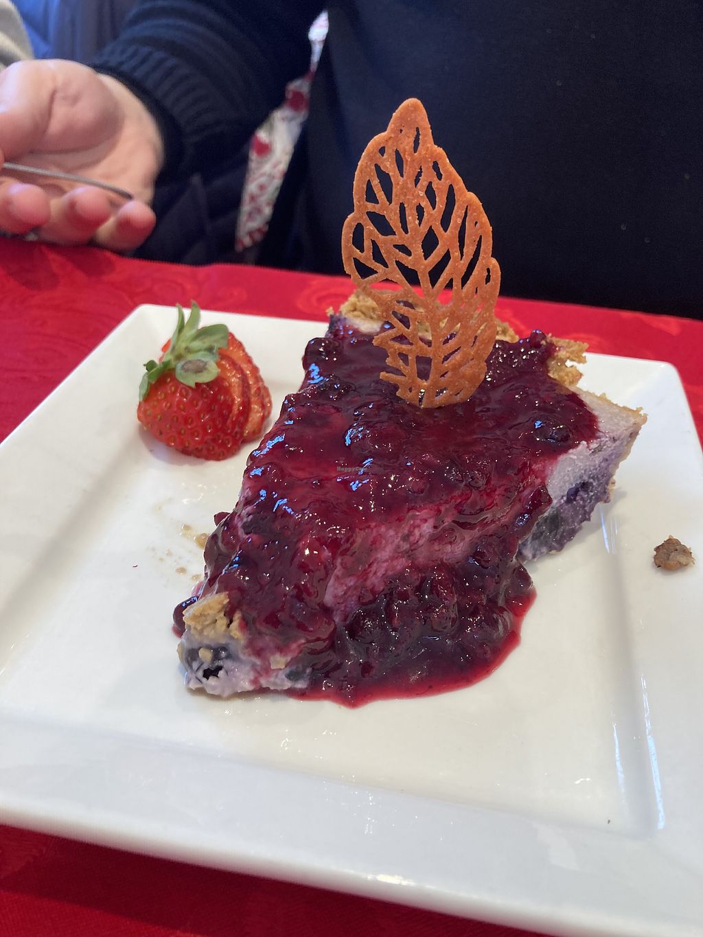 We were all excited for chocolate cake but it seemed about half the dessert options on the menu were unavailable. What we ended up with was good, not amazing. Could’ve used a bit more umph (lemon in the blueberry cheesecake for instance would’ve really elevated it.) Very nice that none of the desserts were overly sweet.