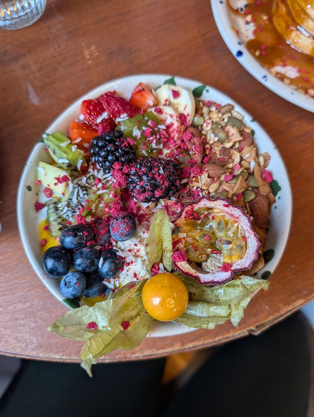 Had a great breakfast bowl with yoghurt (probably coconut), granola and lots of fruit for a good price