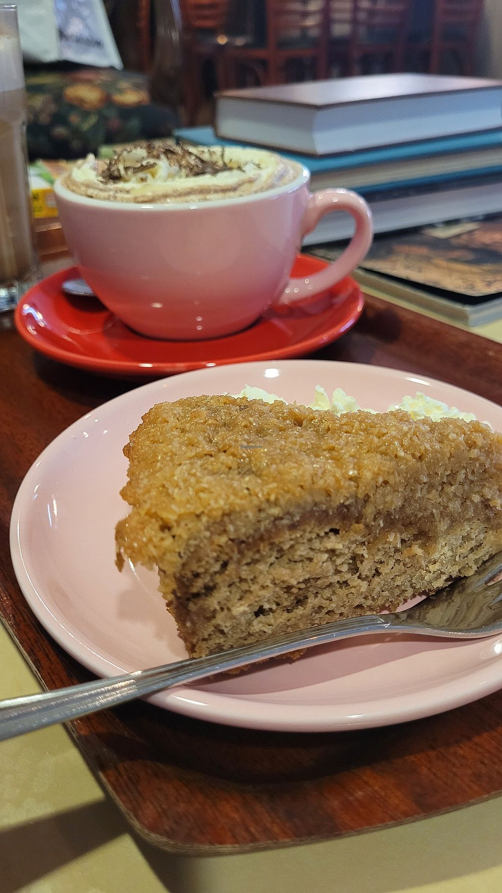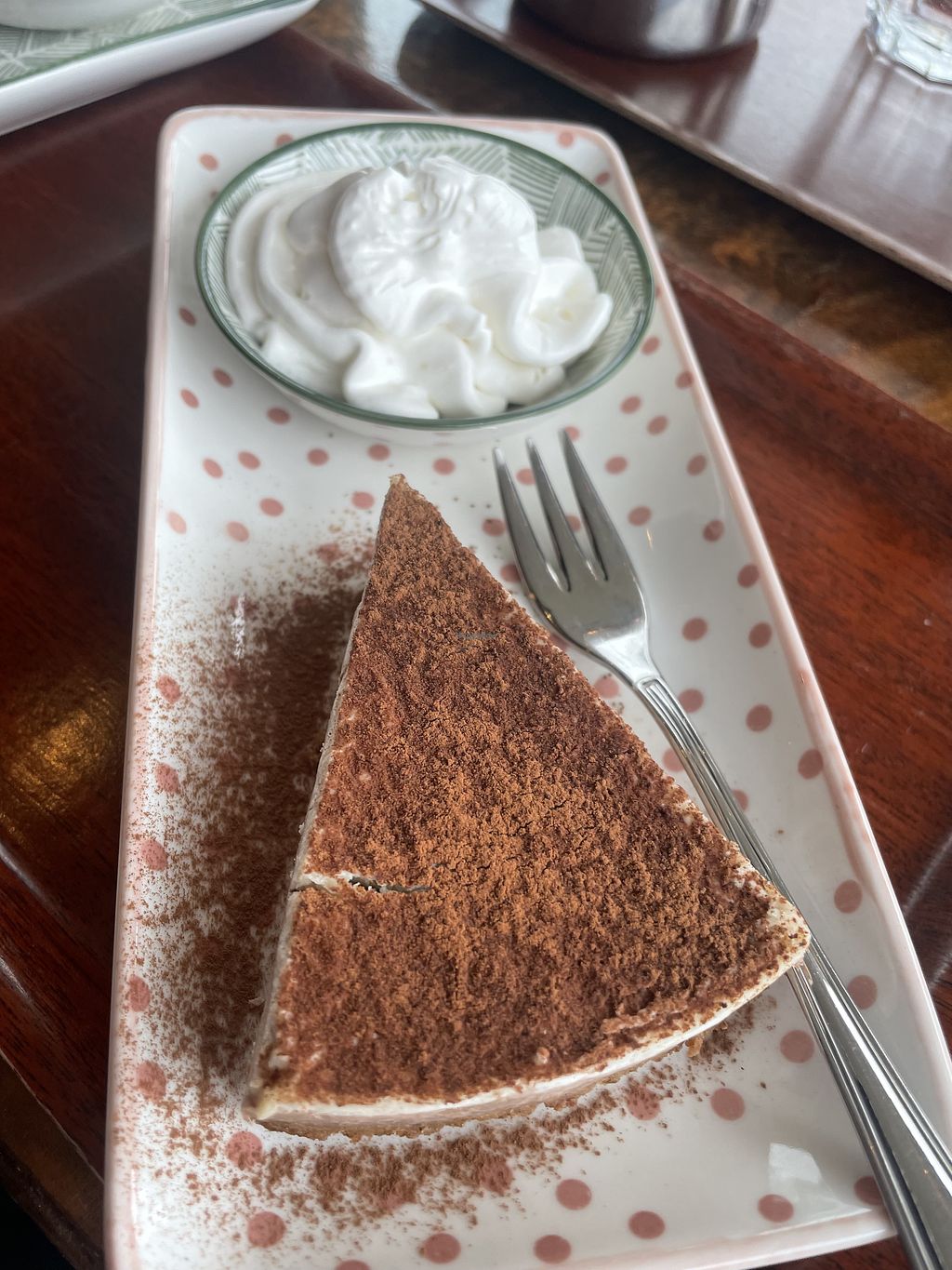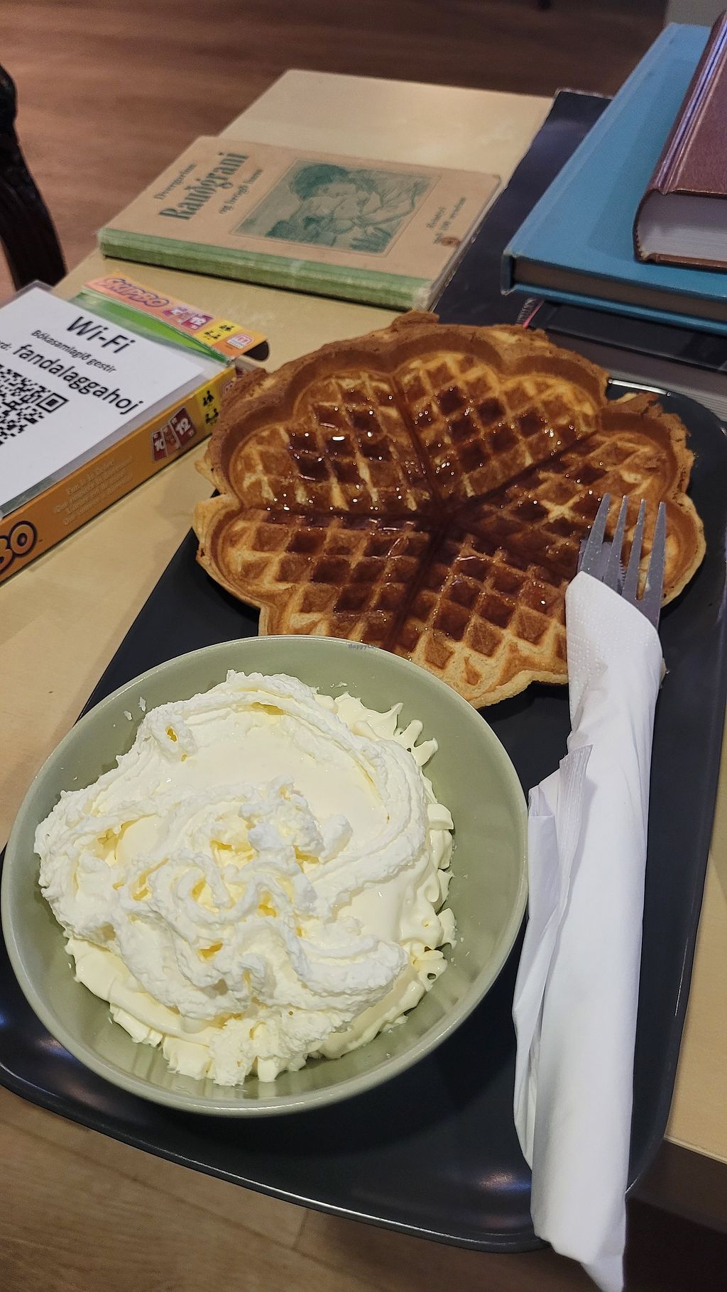 Waffle with vegan cream, jam, and chocolate frosting, and a french pre…