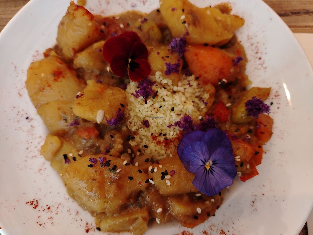 Le recensioni fanno un po' confusione tra i due locali con il nome simile che sono uno accanto all'altro. Questo non è il ristorante gourmet ma anzi un posto dove si ordina al bancone (sia per mangiare lì che per portare via) e ci si apparecchia da soli prendendo posate, bicchieri, tovaglioli eccetera in libero accesso e andando a ritirare i piatti al bancone quando si viene chiamati. È 100% vegano a differenza del ristorante accanto. Il menù scritto sulla lavagnetta è ridotto e cambia spesso, immagino anche in base alla stagione. Abbiamo provato una entrée, il gratin di patate dolci e zucca, semplicemente divino! Come piatti ottimi la tajine di verdure con il cous cous e il dhal di lenticchie rosse.
