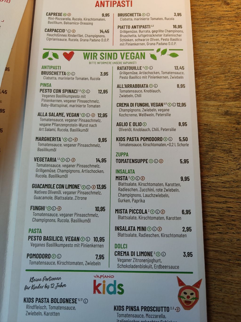 In pedestrian zone in central Hannover. Around 100 seats inside. Each type of dish is available vegan (clearly labeled): Salad, soup (in autumn at least due to pumpkin season), noodles (home made), pinsa (like pizza). Choice of wines is corrects, desserts sadly nit vegan. Recently, you can opt out of garlic in any dish — thanks (i dislike garlic). When everything else is closed, Vapiano may be open, including bank holidays, pandemia, etc. Kitchen obviously closes earlier than restaurant opening hours.