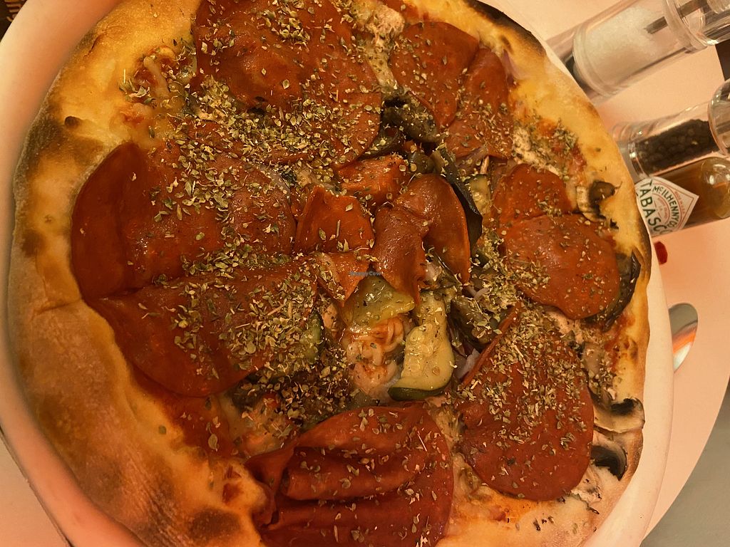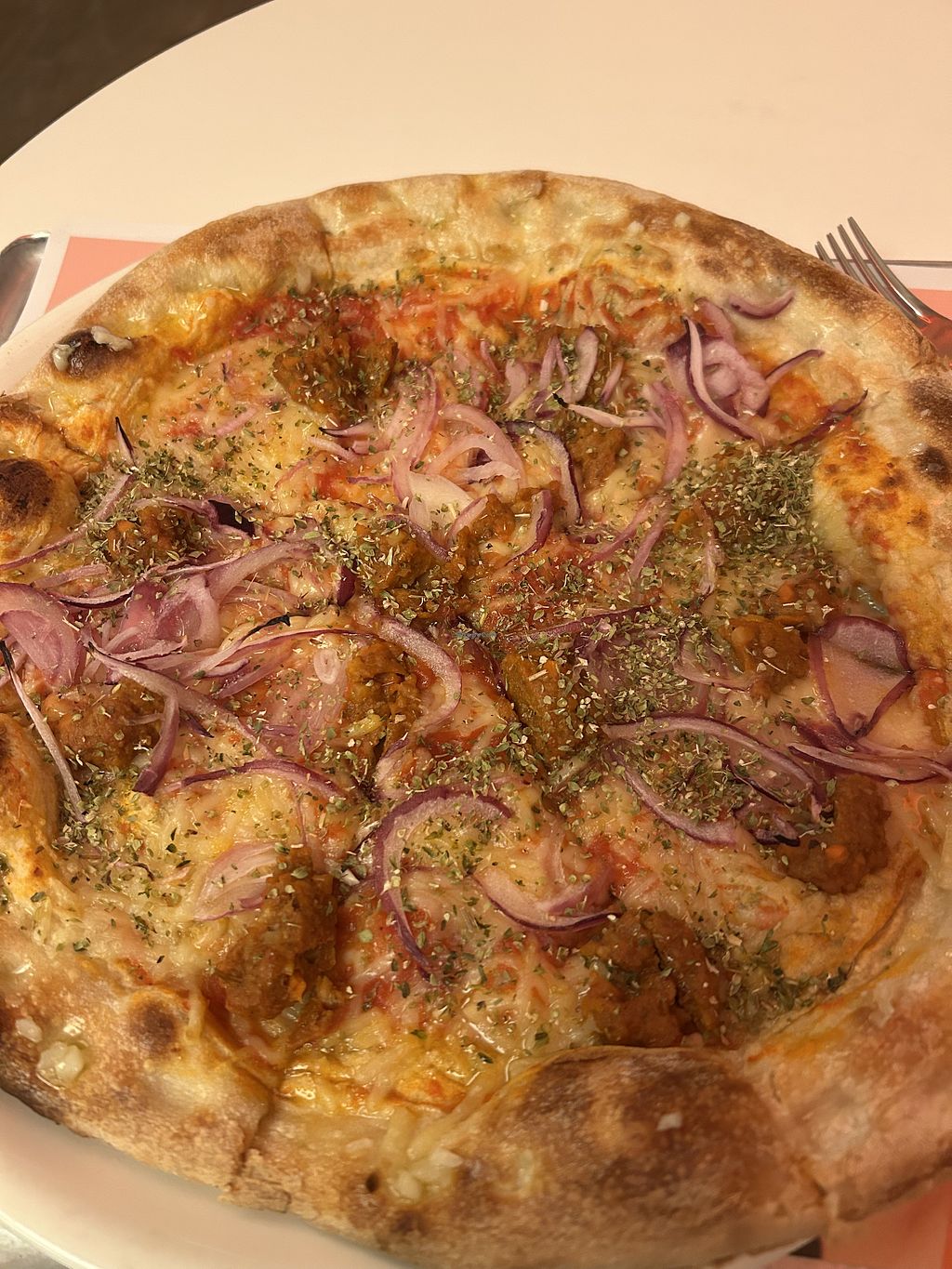 Vegan Pizza with basil pesto, vegan cheese, spinach & tomatoes