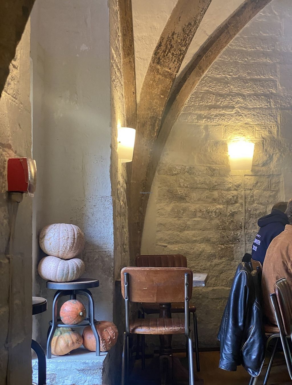 Good and decent priced veggie breakfast place in very old medieval room, a side of a must visit church and close by an incredible library.