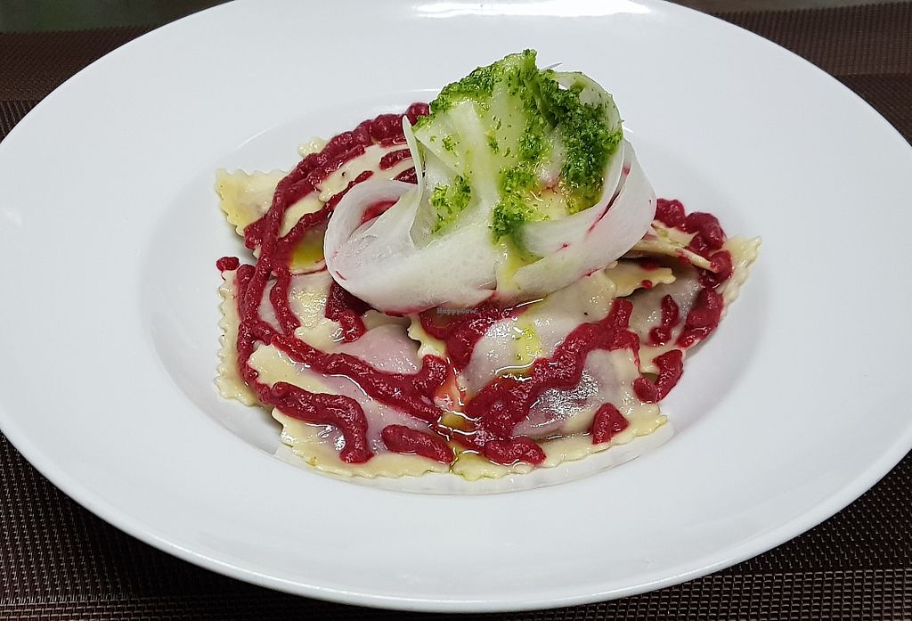 Ravioli filled with horseradish, cherry and mashed potatoes, served …