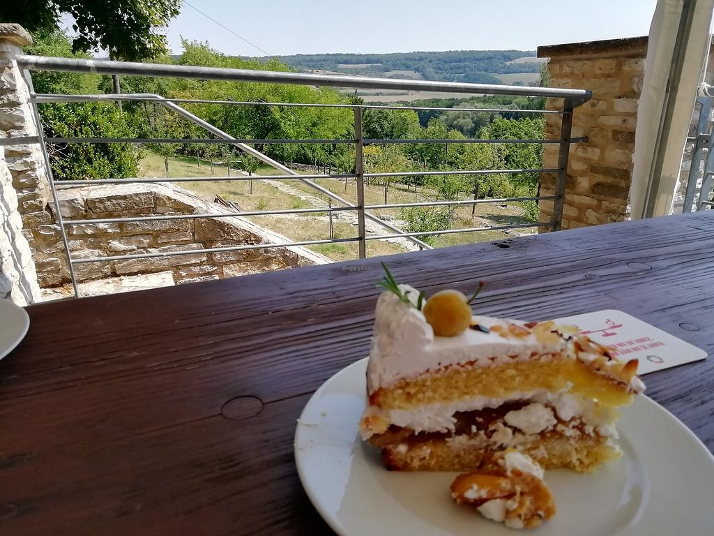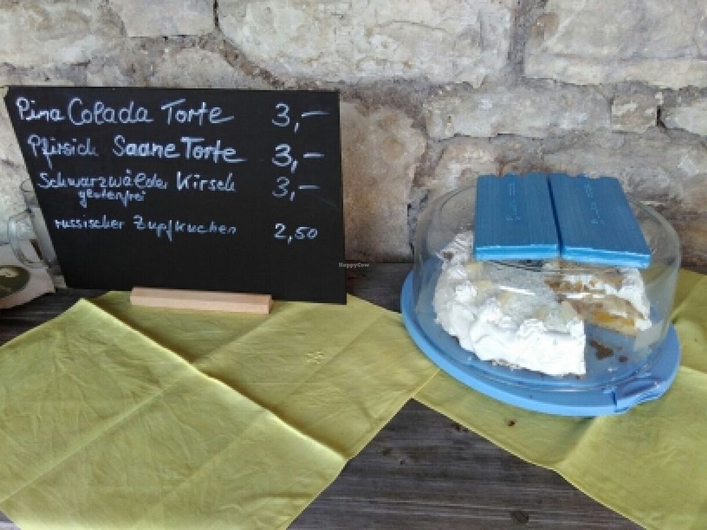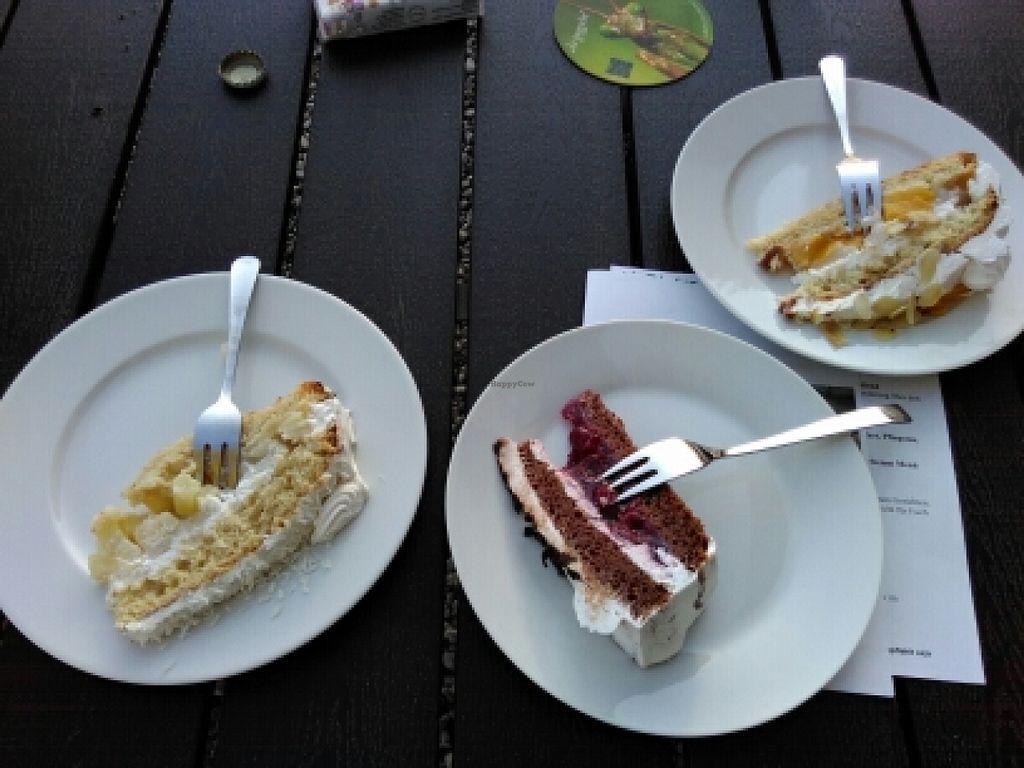 Vegan piña colada cake, black forest cake and peach cream cake (pieces…