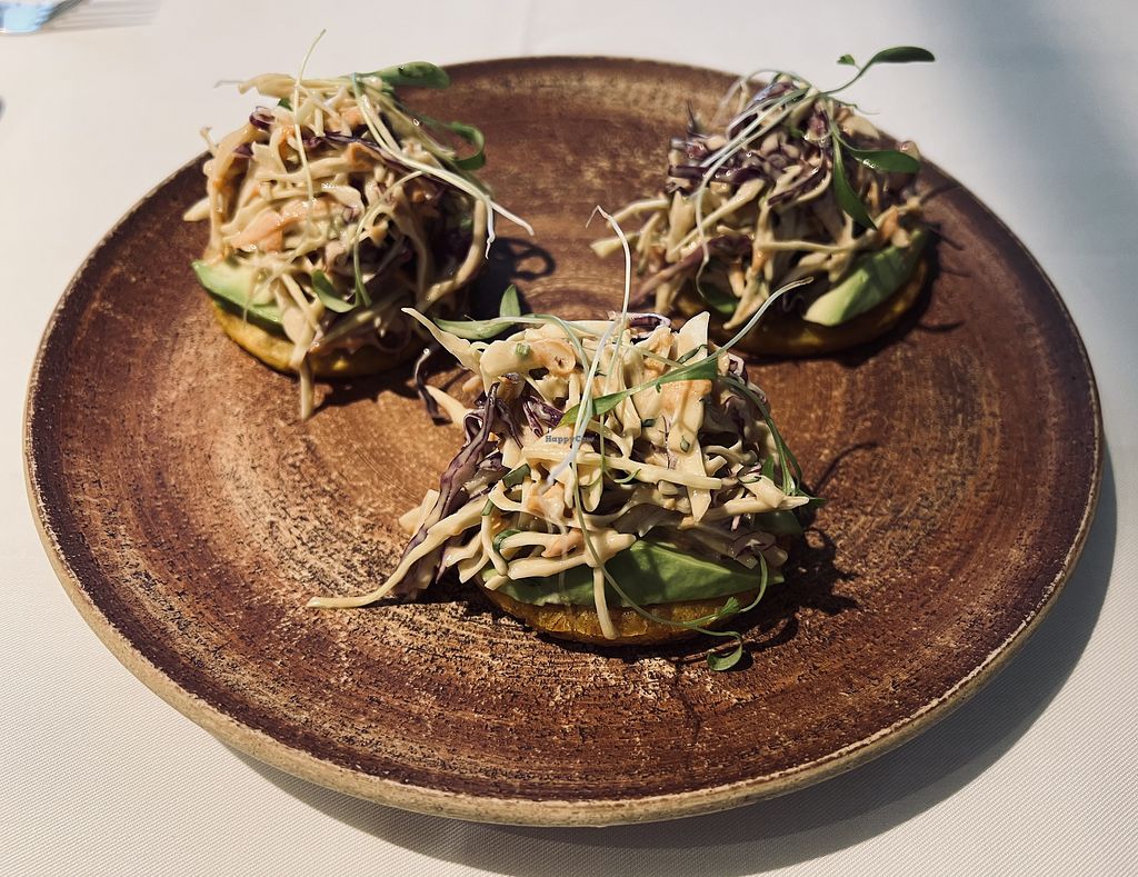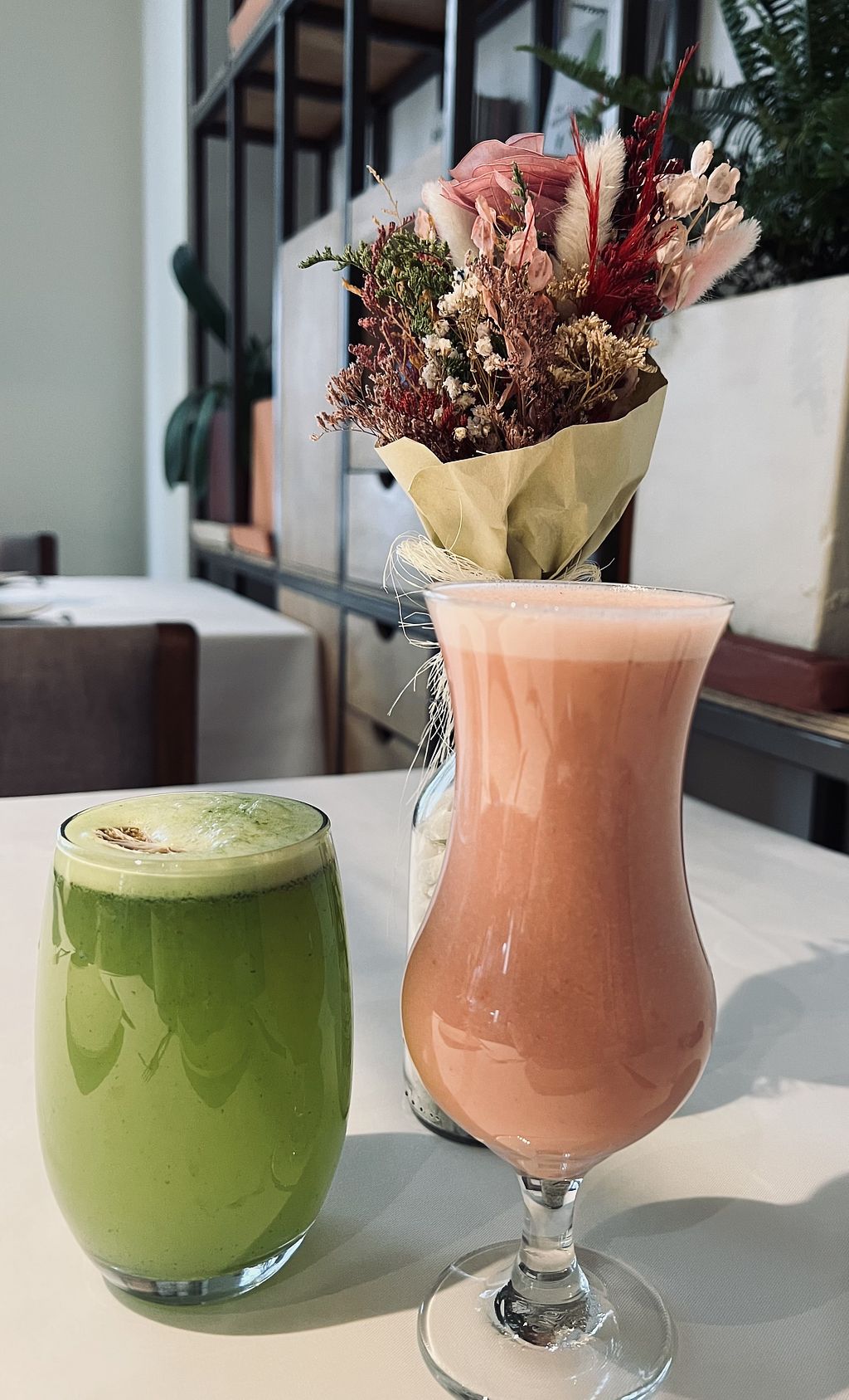 Ensalada de papaya, tostadas con ricotta vegetal y tomates, kombucha d…