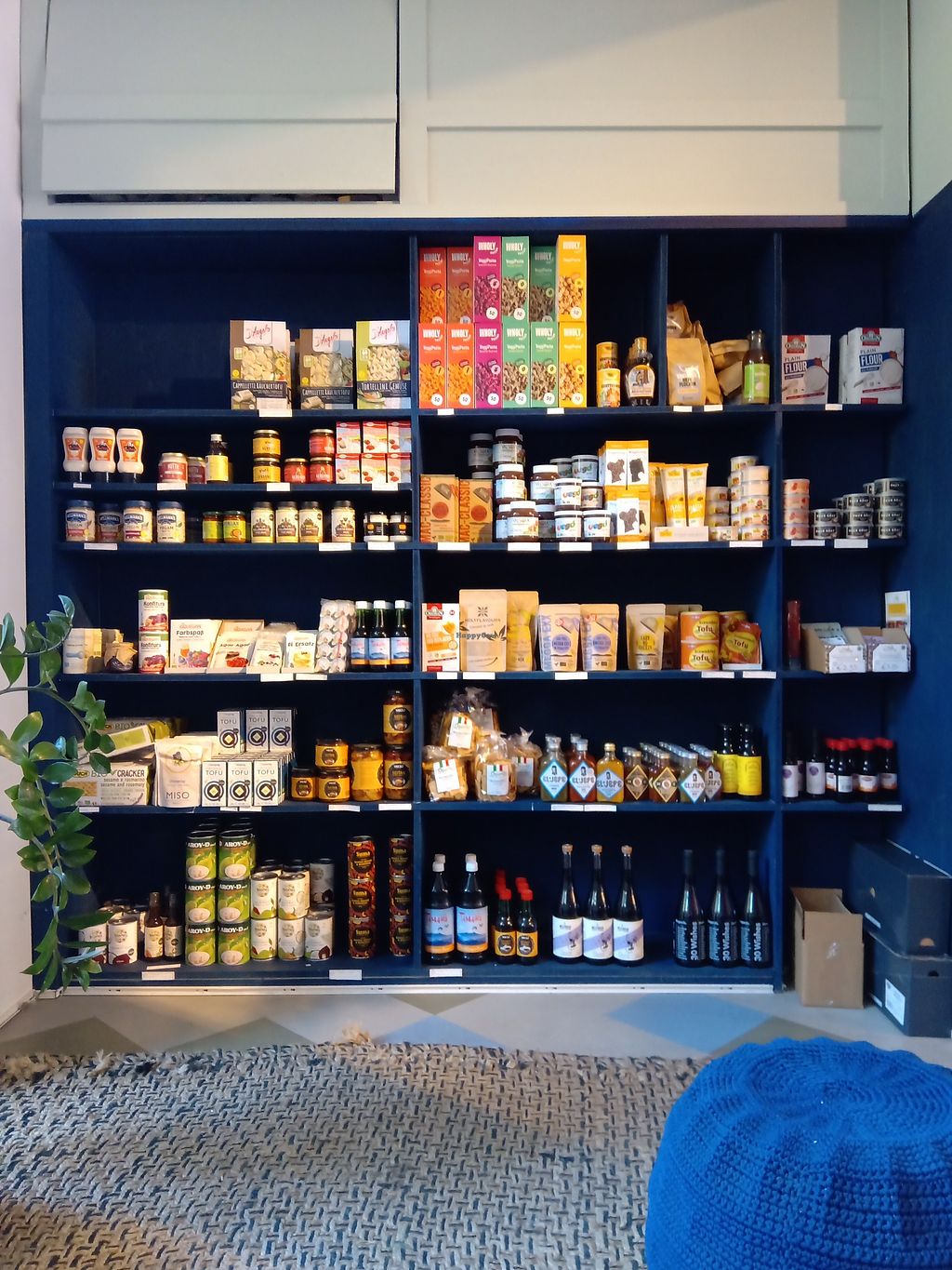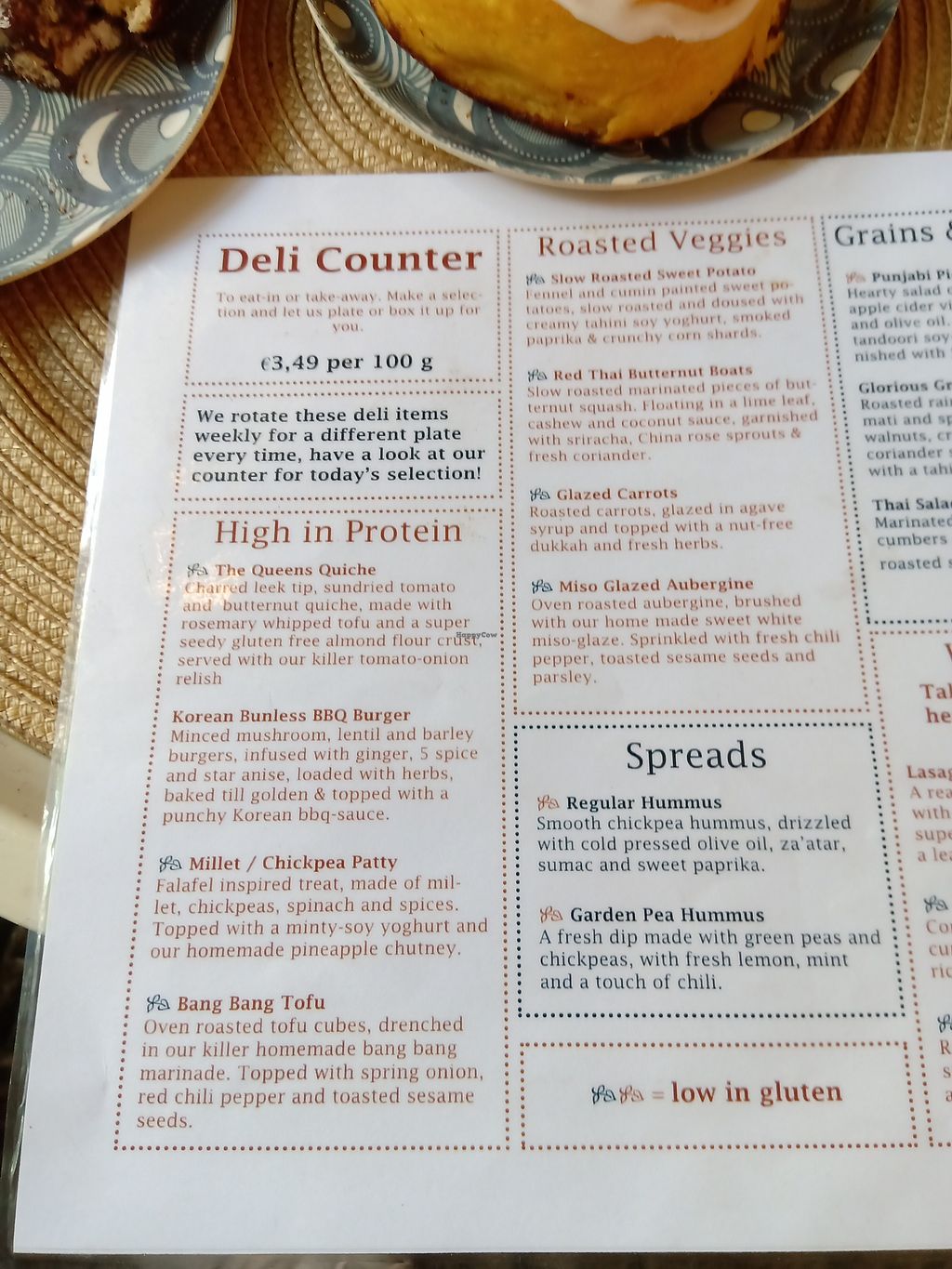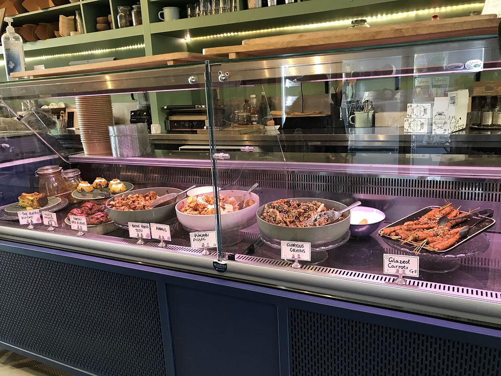 Deli counter menu: grains and legumes, green veggies, warm meals