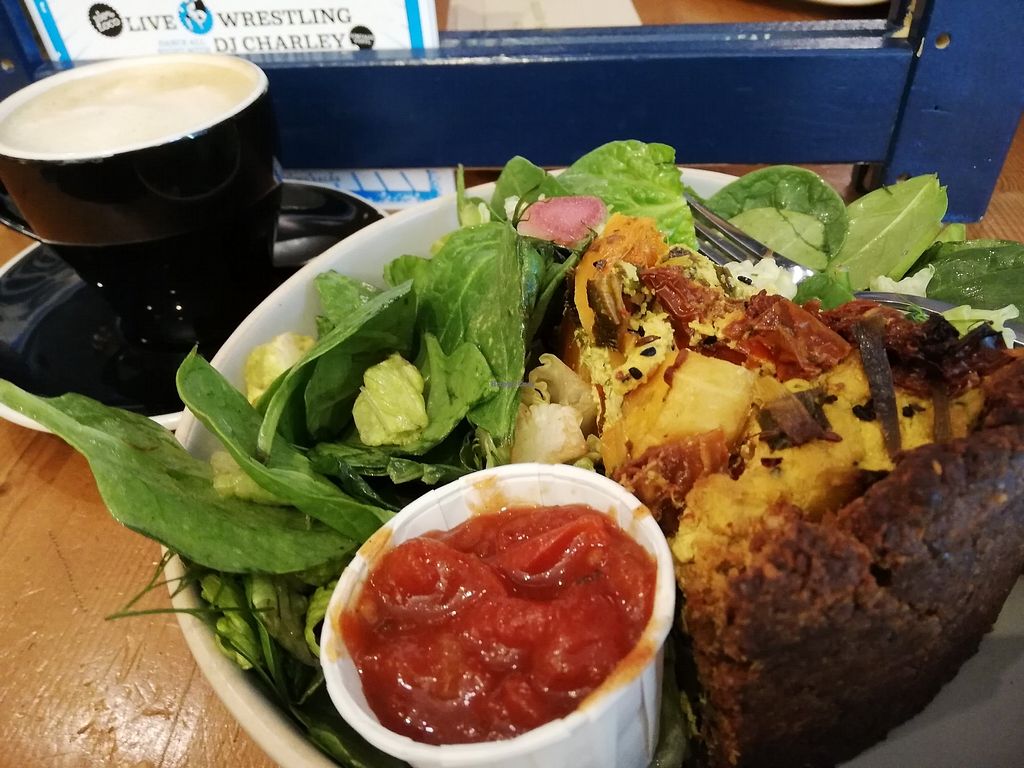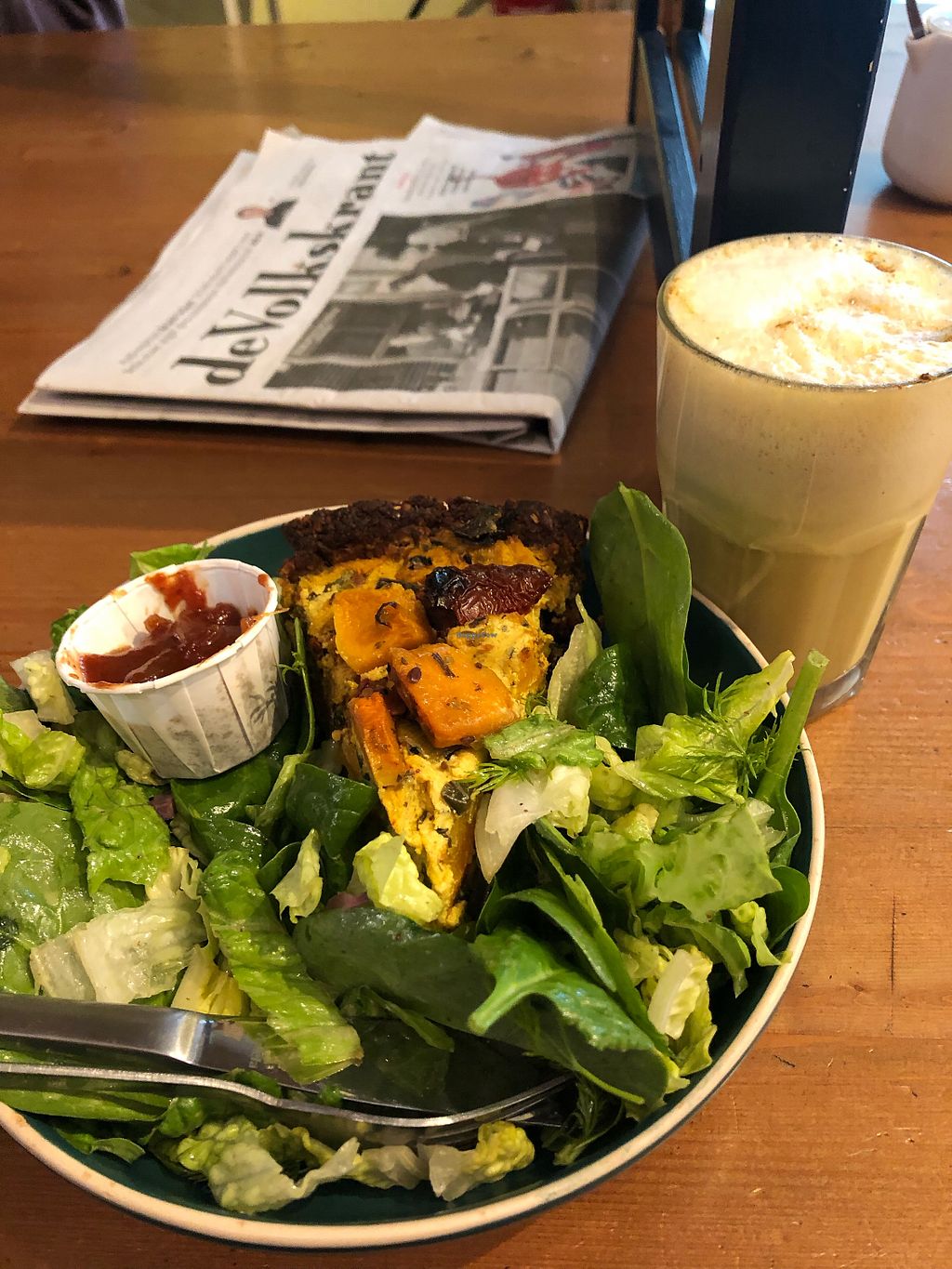 Quiche hiding in a mountain of fresh salad leaves. Tasty af.
