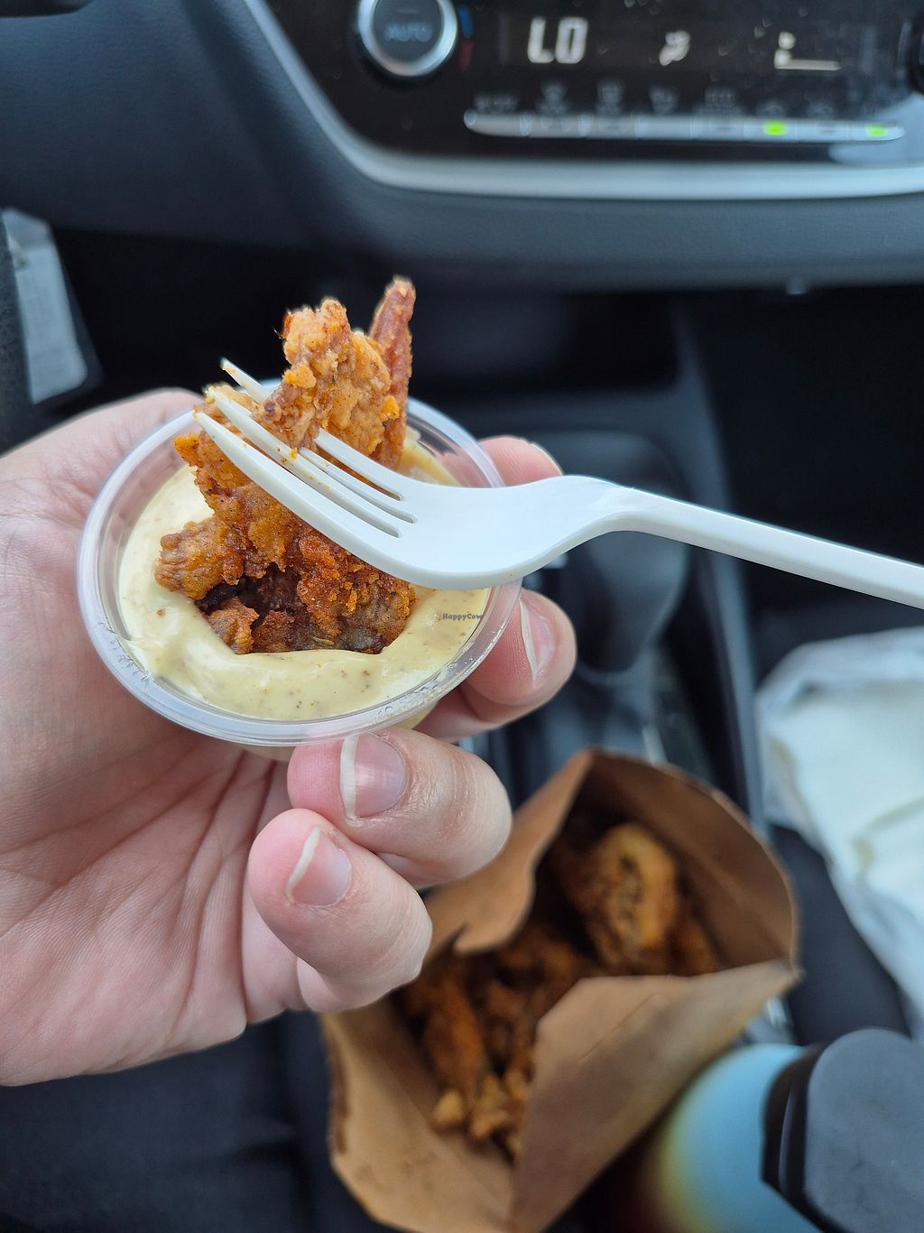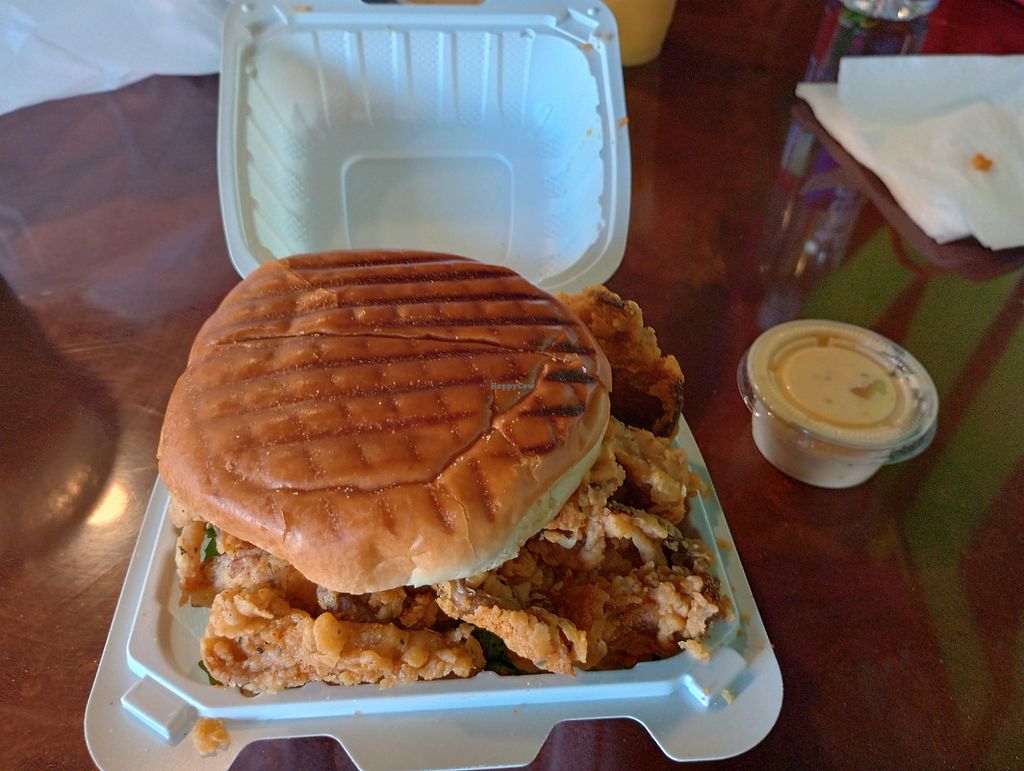 I liked the chikn sandwich but I think that it would have been much better as a wrap. When I received it, the sandwich was so stacked up with filling/deep fried mushrooms that - I could not get it out of the container and I could not have possibly taken a bite. The crispy mushrooms (chikn) were delicious and I ended pulling most of them out and dipping them in bbq sauce. Fries- meh. Not really French fries but thinly sliced potatoes.