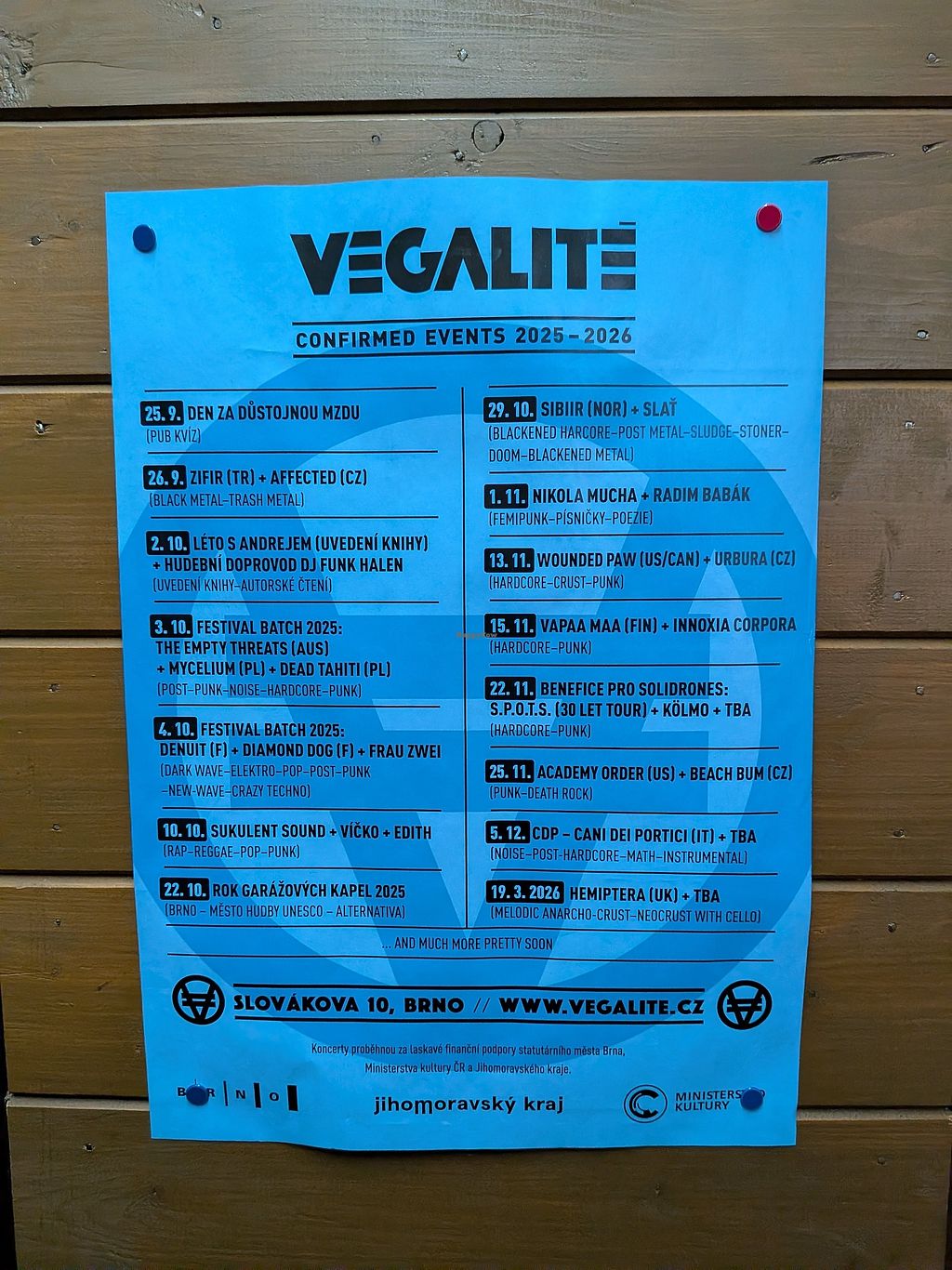 Veggie pub offering daily menus with soup and complimentary water with fruit. A la carte menu features 50+ vegan, vegetarian, and gluten-free dishes; house-made ice lollies and traditional Czech meals prepared the vegan way -- served Mon-Fri till 10pm, Sat till 10pm. The bar offers a selection of Czech beer as well 2 Vegalité beers (lager and wheat beer) plus both alcoholic and non-alcoholic drinks. Has children's corner, smoking and non-smoking sections. Hosts live underground D.I.Y. music events. Est. since 2009. Reported fully vegan April 2023. Companion animal friendly. Open Mon-Fri 11:00-00:00, Sat 16:00-00:00. Closed Sun.