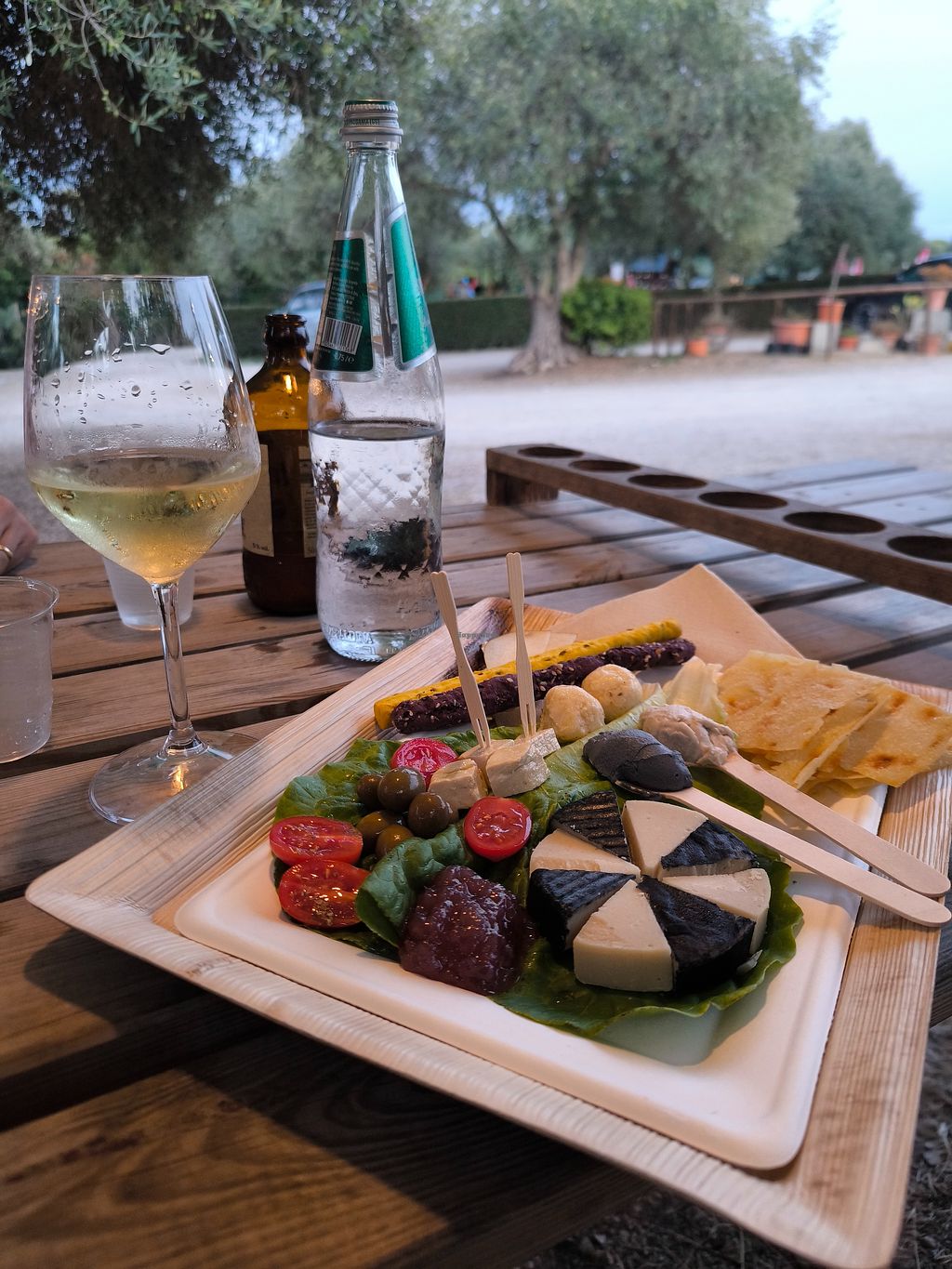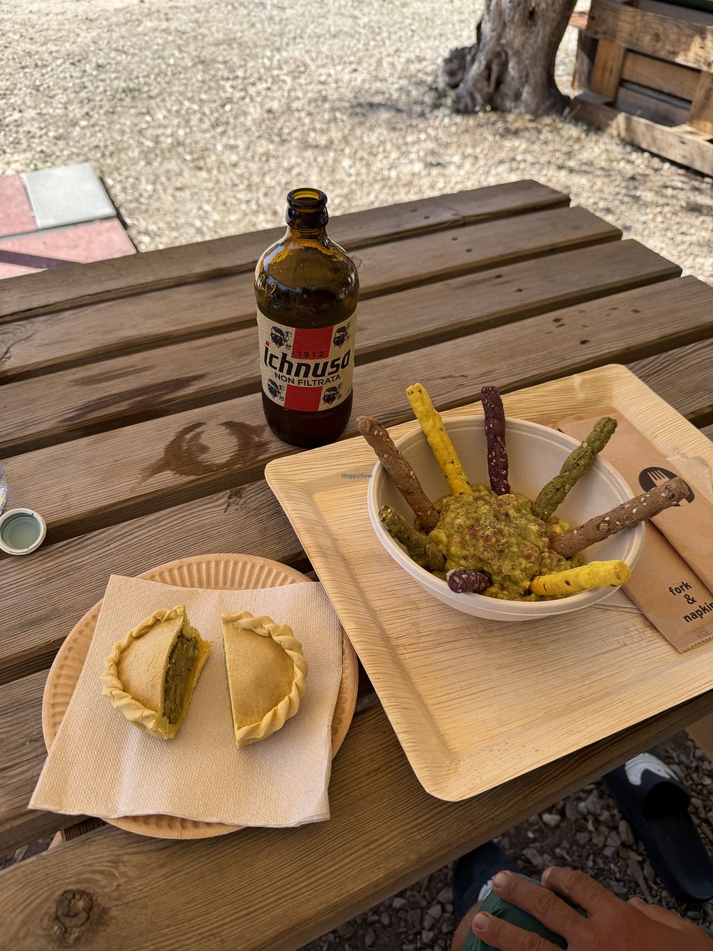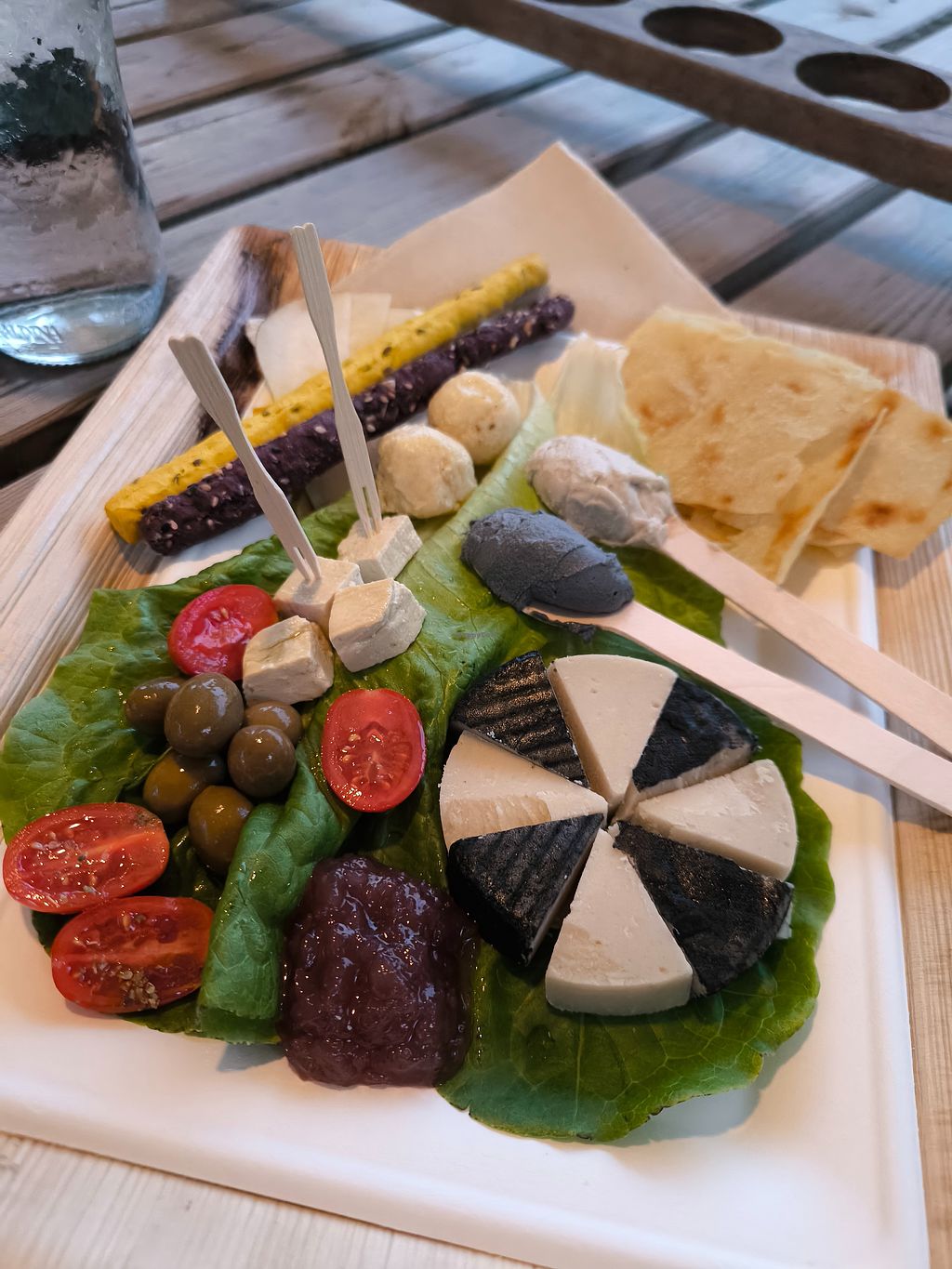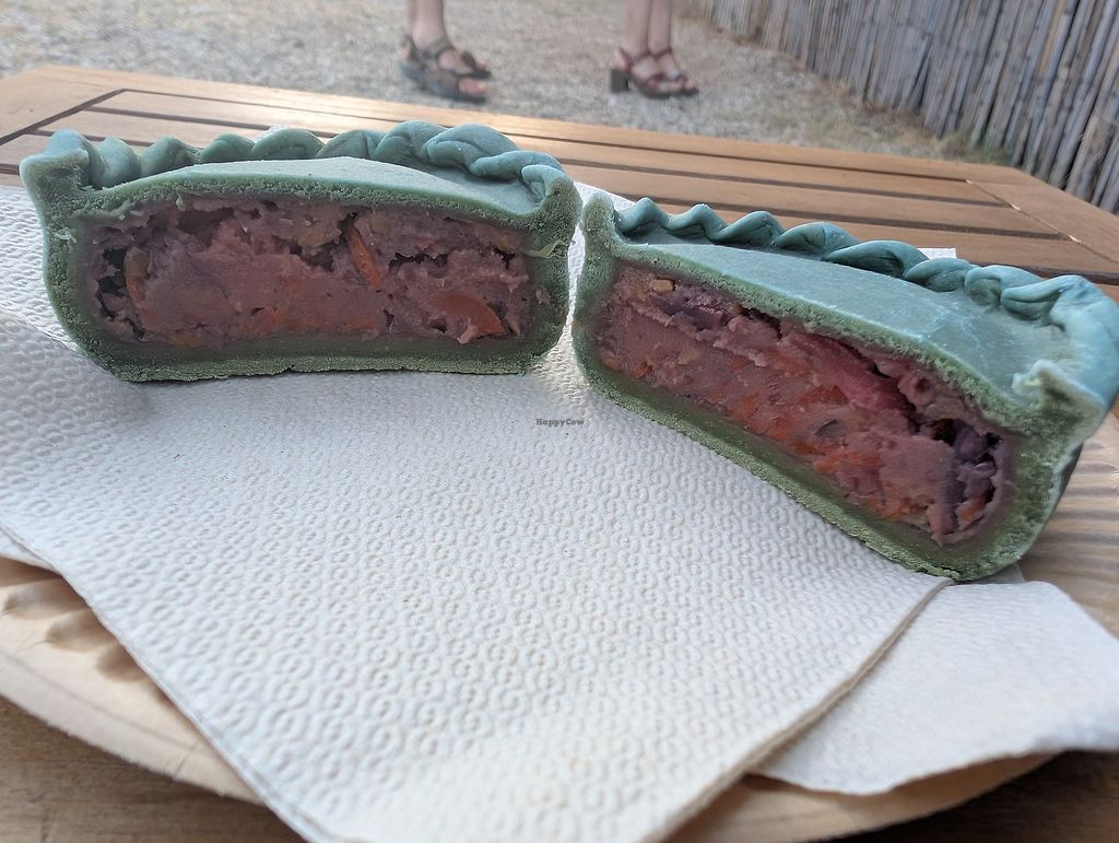 Sardinian Panada appetizer with white beans, beets, pistachio, cabbage