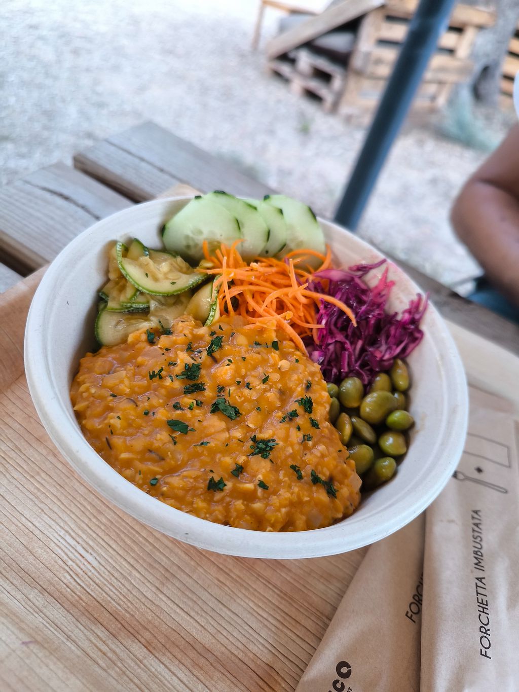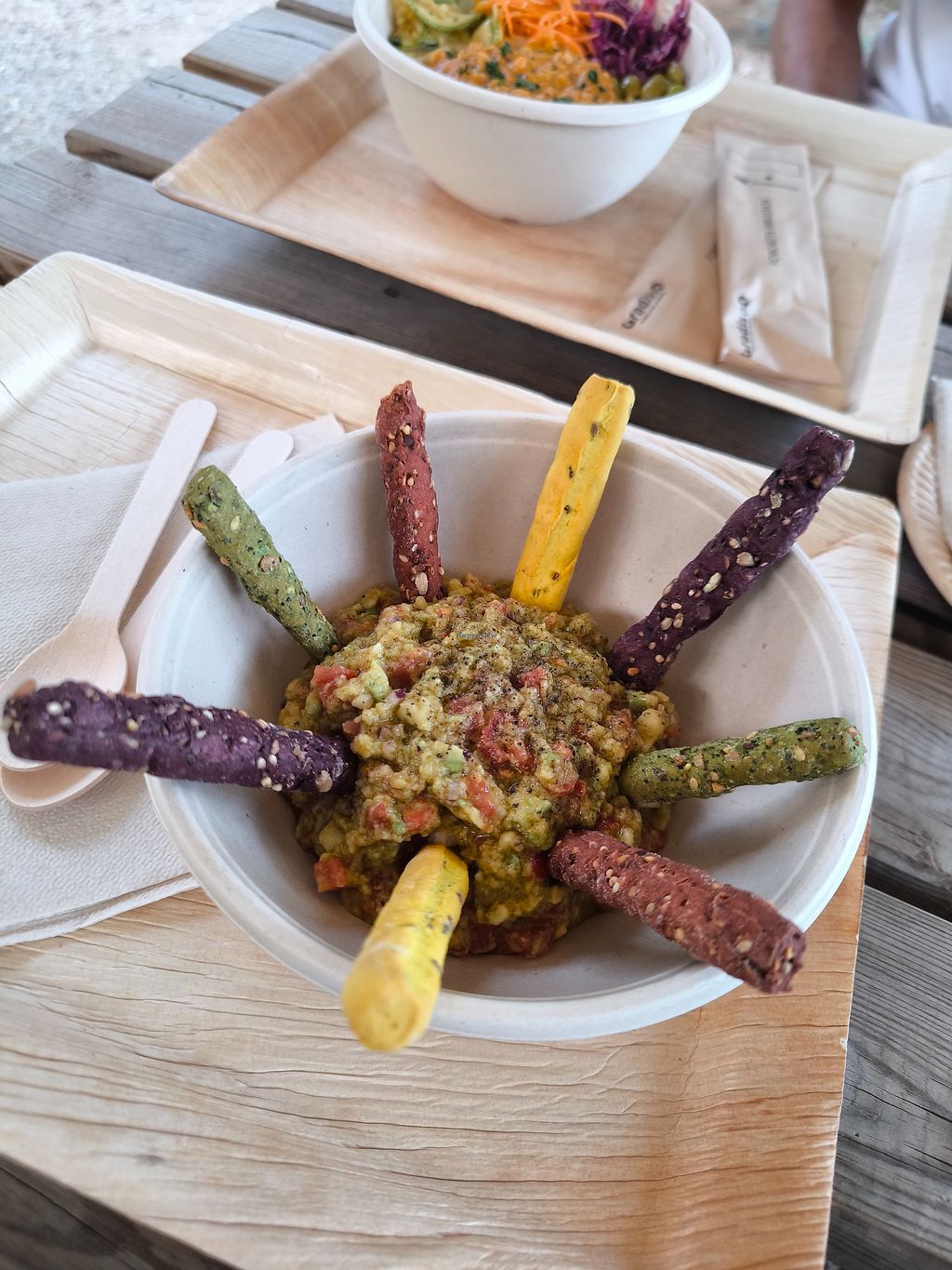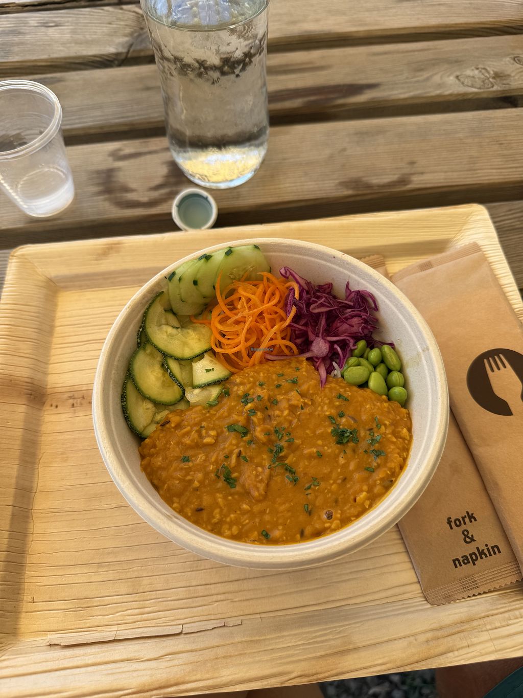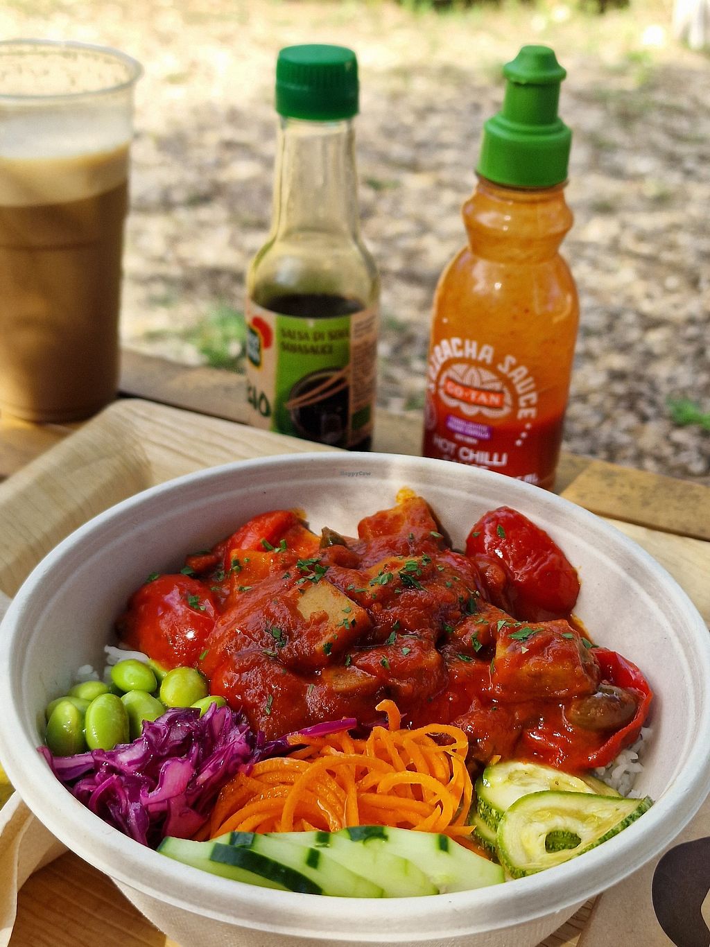 Thai rice, summer veggies, babaganoush and falafel. 100% vegasn, organ…