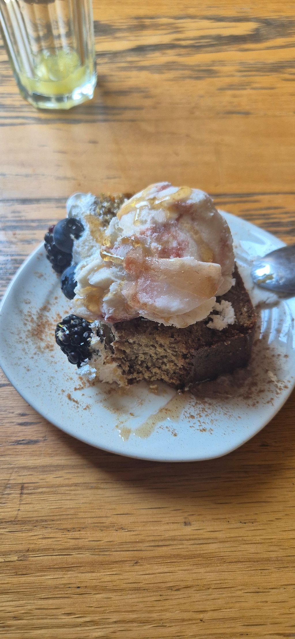 Off the main street, pretty quiet atmosphere, excellent food at a really good price. Big portion sizes, with a small store to get a variety of dairy free milks (oat, almond, soya)