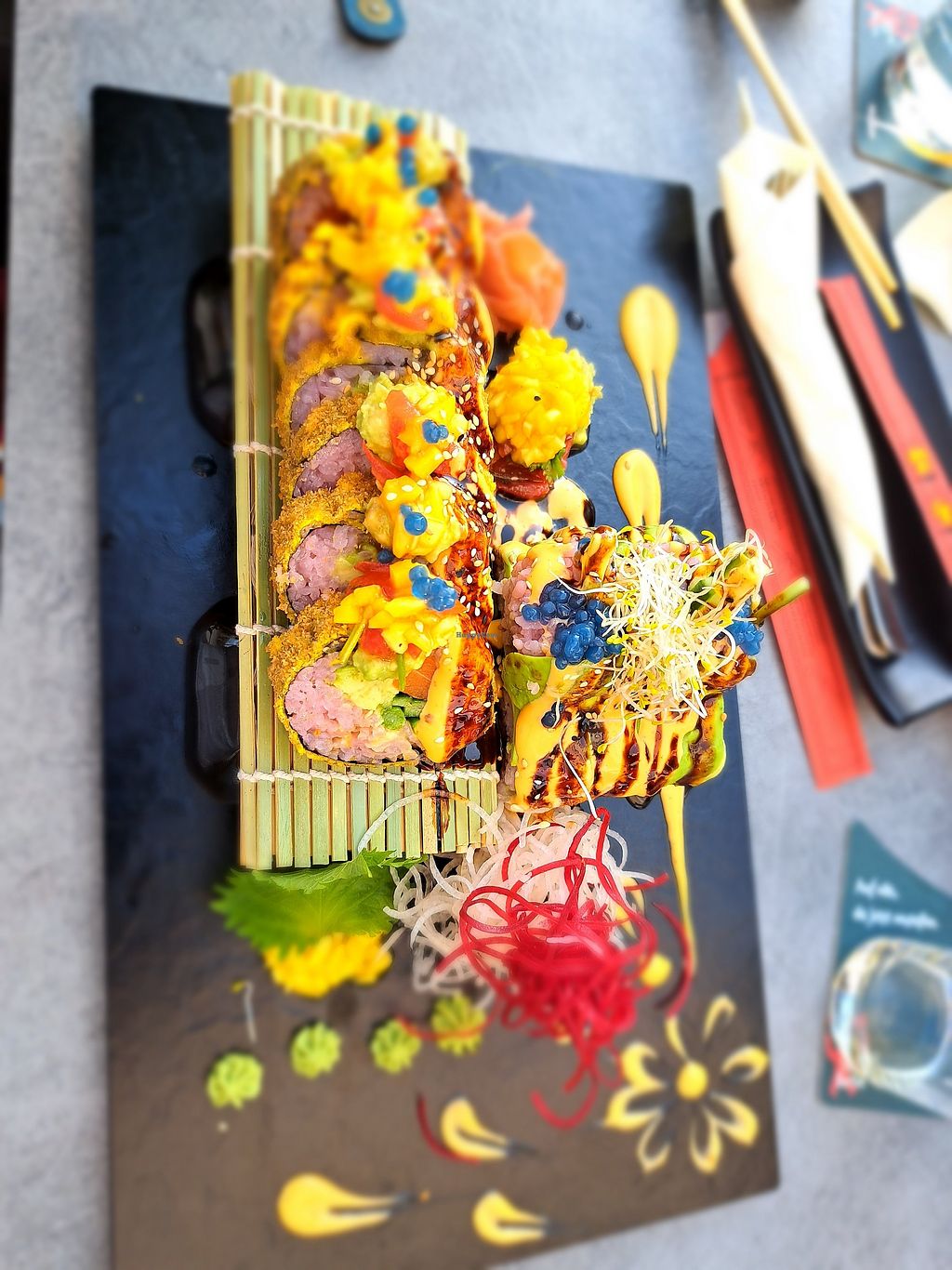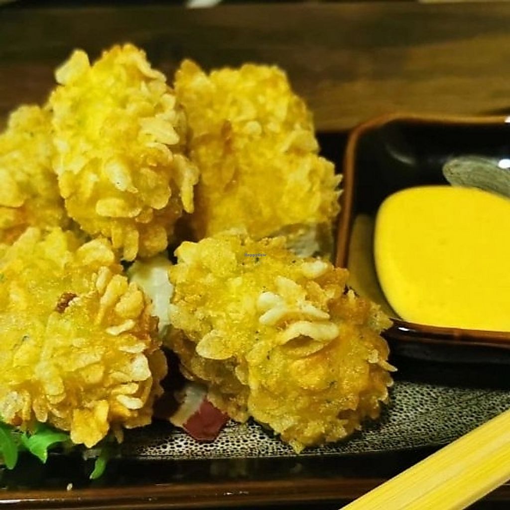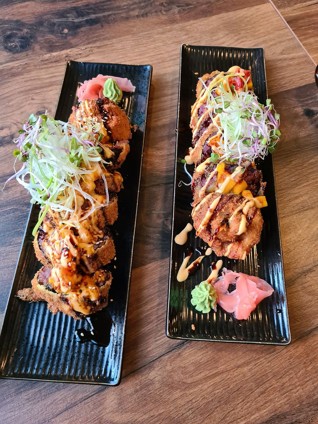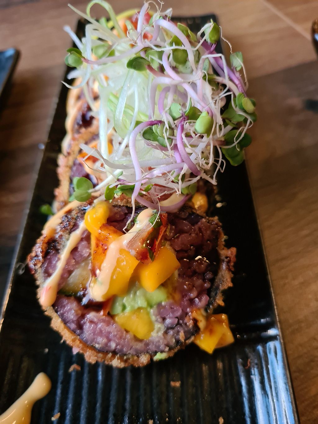 The crunchy chicken rolls were amazing! They came with a mango topping, teriyaki sauce and mayo.