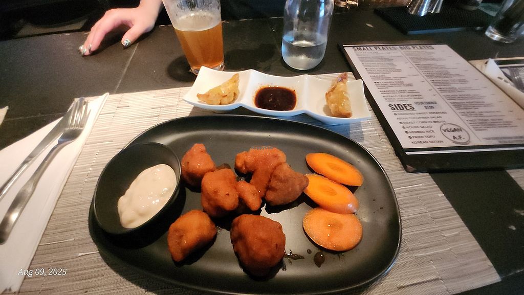 Buff Cauliflower and pot stickers were awesome!! Cute small spot. Sat at the bar. Customer service was great, even when busy. No draft beer. I don't give af but thought I'd note it as it's a thing for some.