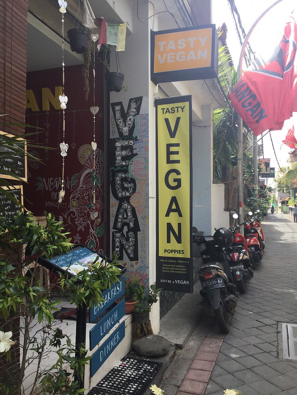 Offers a variety of Indonesian and western vegan dishes, including pizza, burger, tofu scramble, pancake with ice cream and fruit, noodles, waffles, and more. Owner speaks English. Est. 2017 formerly as Tasty Vegan. Confirmed closed, Sep 2021.