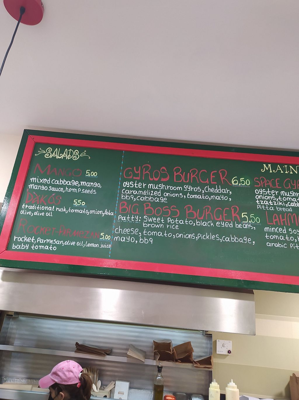 Vegan street food restaurant serving a local and international menu. Dishes may include mousaka, big boss burger, gyros, and banoffee pie. Open Mon-Sat 11:00am-10:00pm.