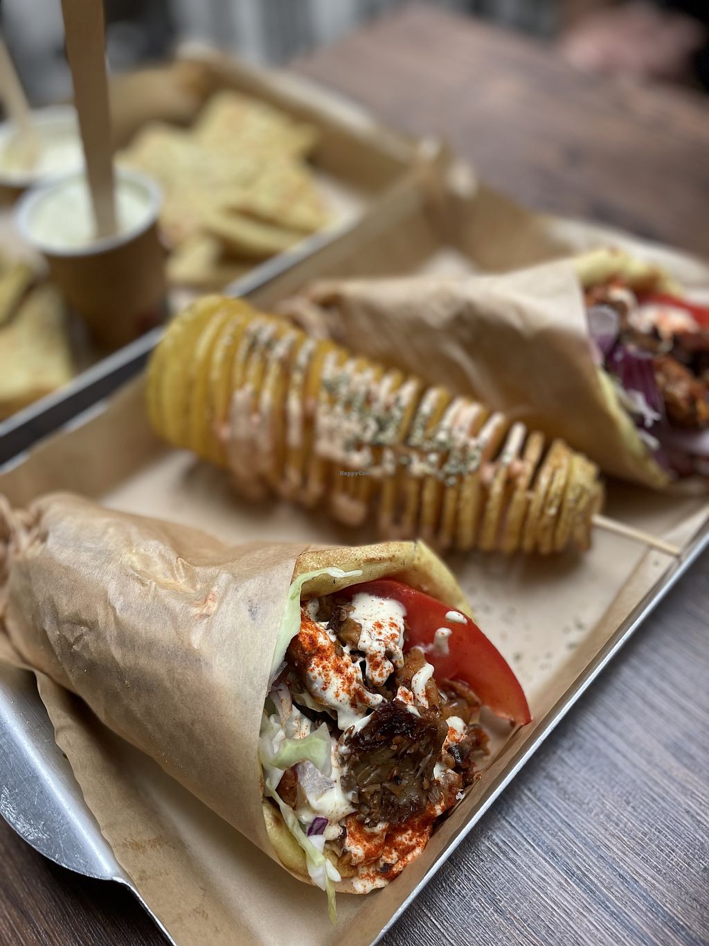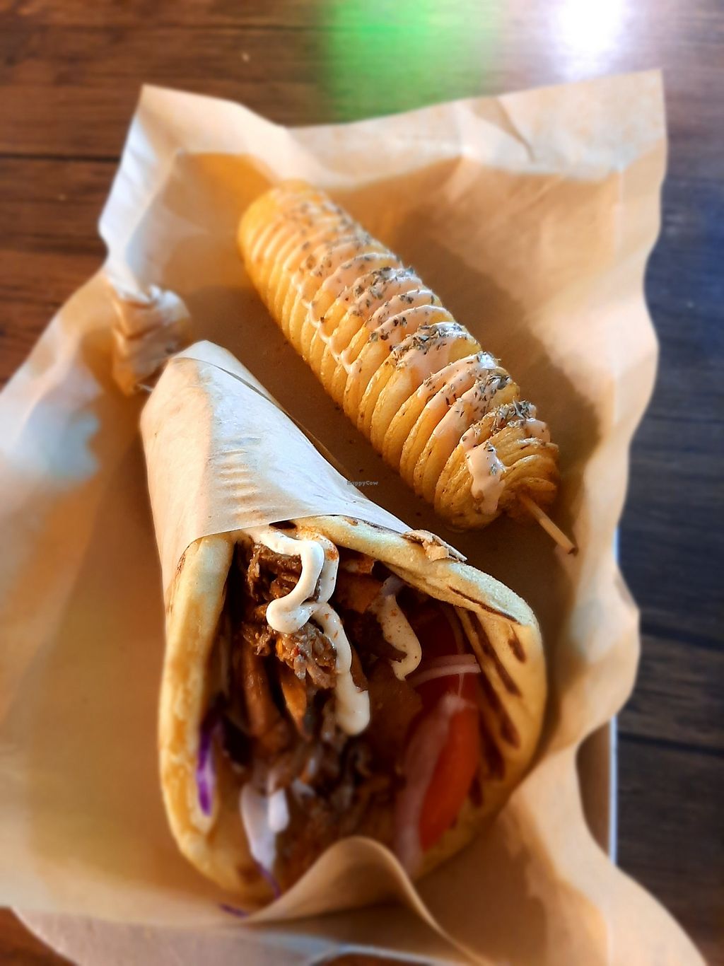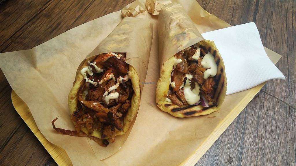 The gyros is made of mushrooms. Really good. And the pita bread is amazing ! So fluffy.