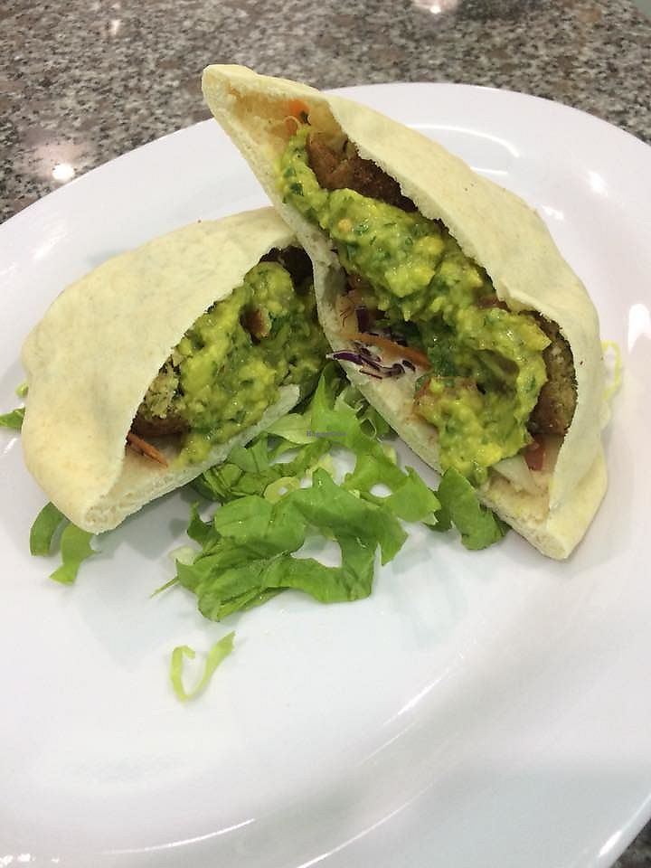 Falafel in a fresh homemade pita with guacamole and cous cous salad