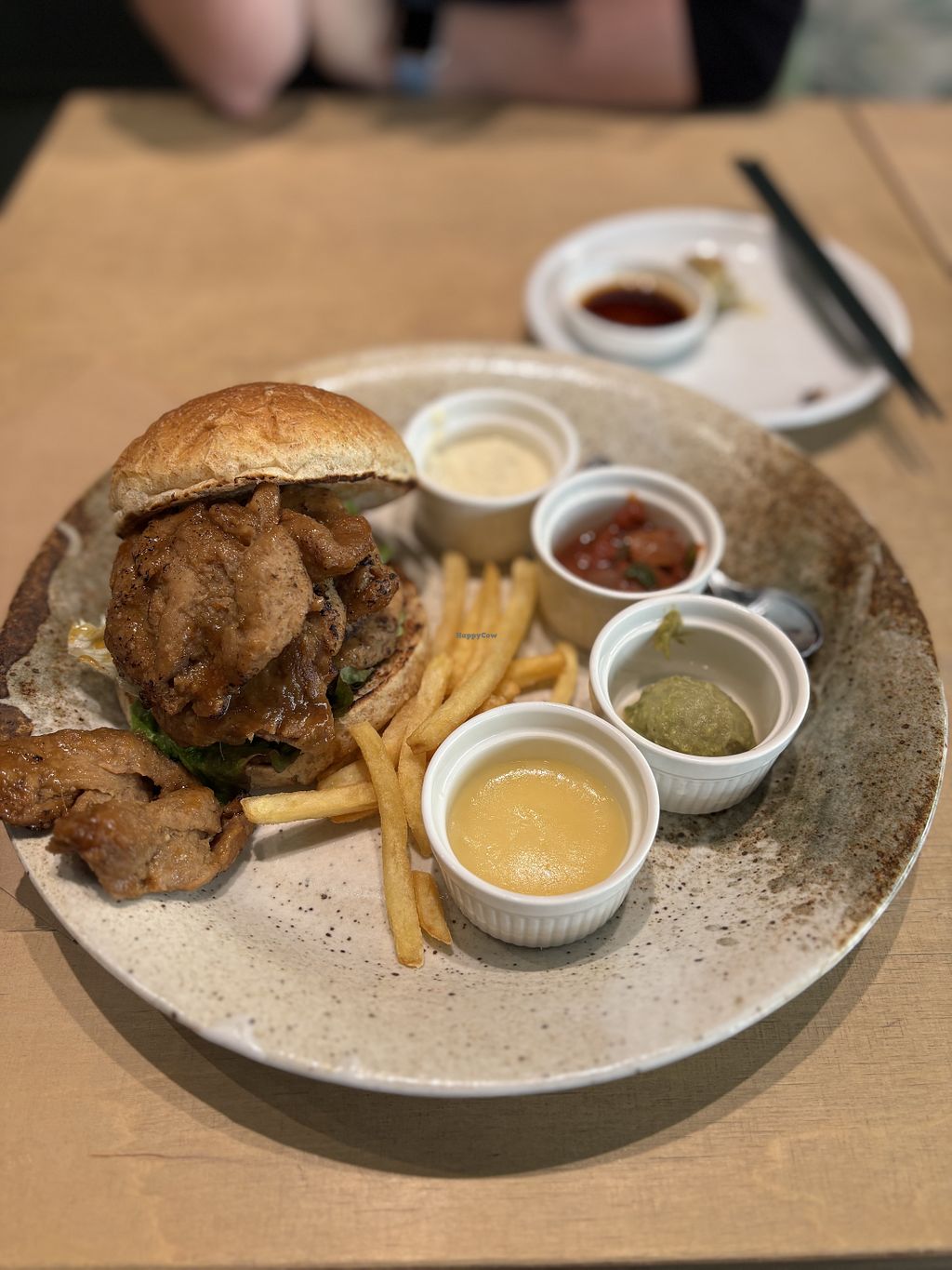 Burger with extra portion of soy meat. So many sauces and hardly any c…