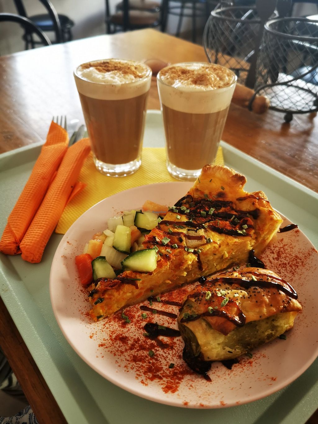 Cappuccino and quiche and tofu pastry. Verry good. ๐