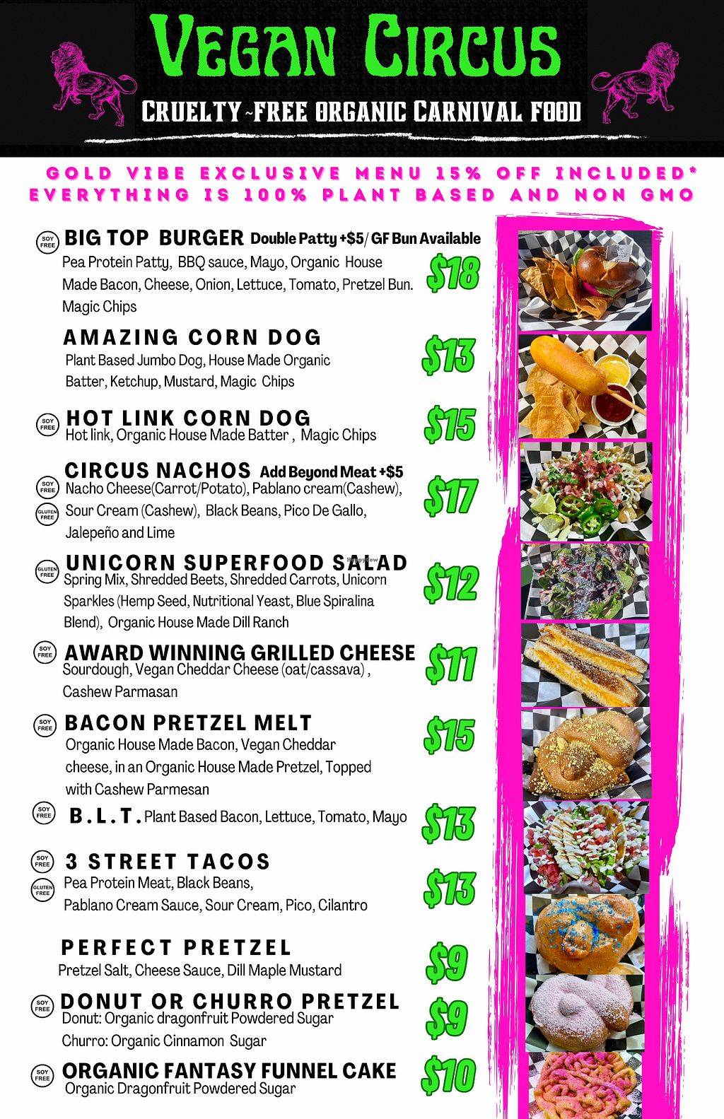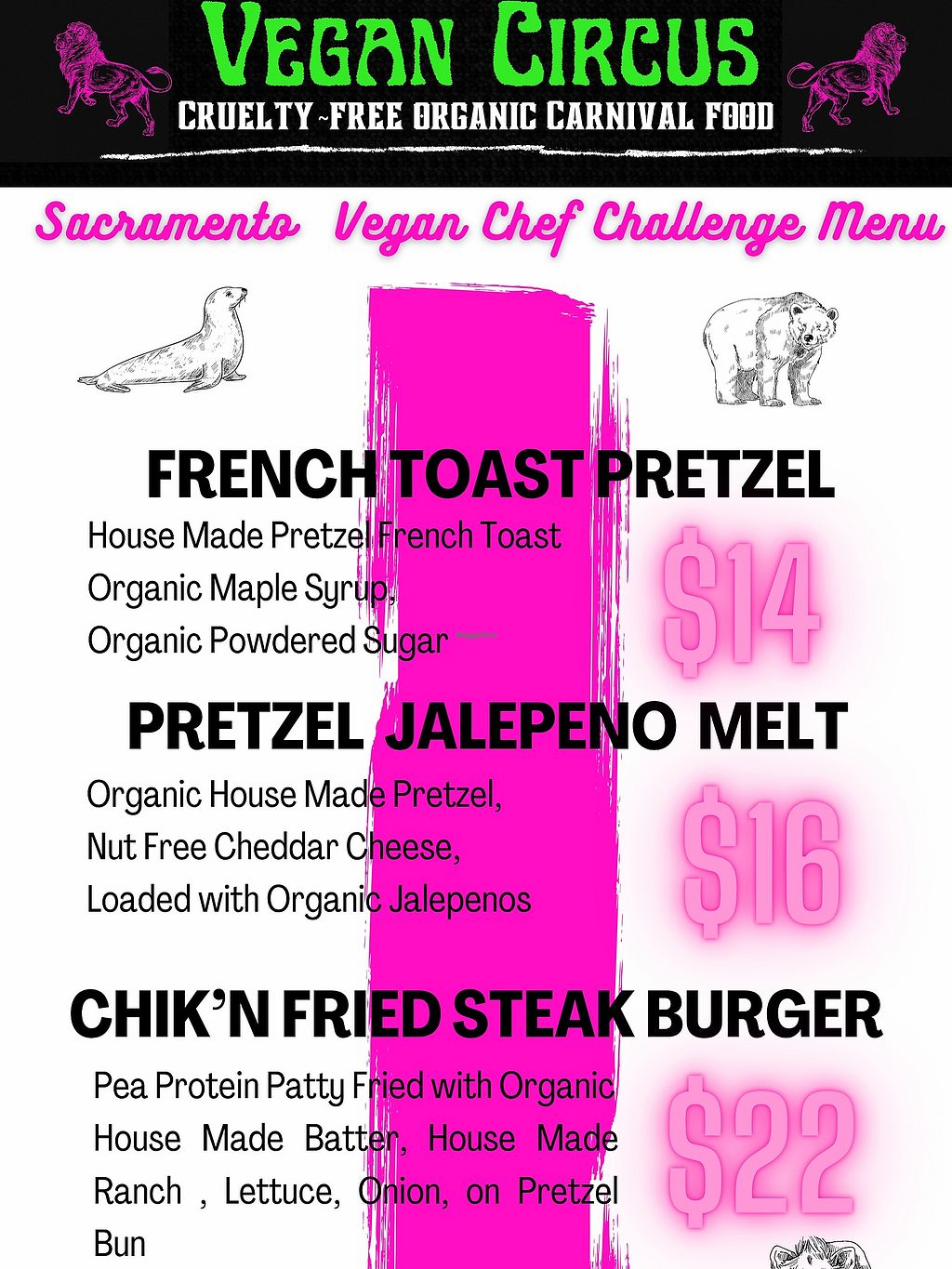 Offers fully vegan cruelty-free carnival style food using all non-GMO and organic ingredients, including corn dogs, hot dogs, burgers, churros, funnel cakes and carnival classics. A food truck is available for private parties and events. Food is available for phone/pick up orders, plus delivery on Door Dash. Donates 15% of profits to liberating animals in captivity. NOTE: From January 2023 catering and private events only. Open Mon-Sun 9:00am-9:00pm.