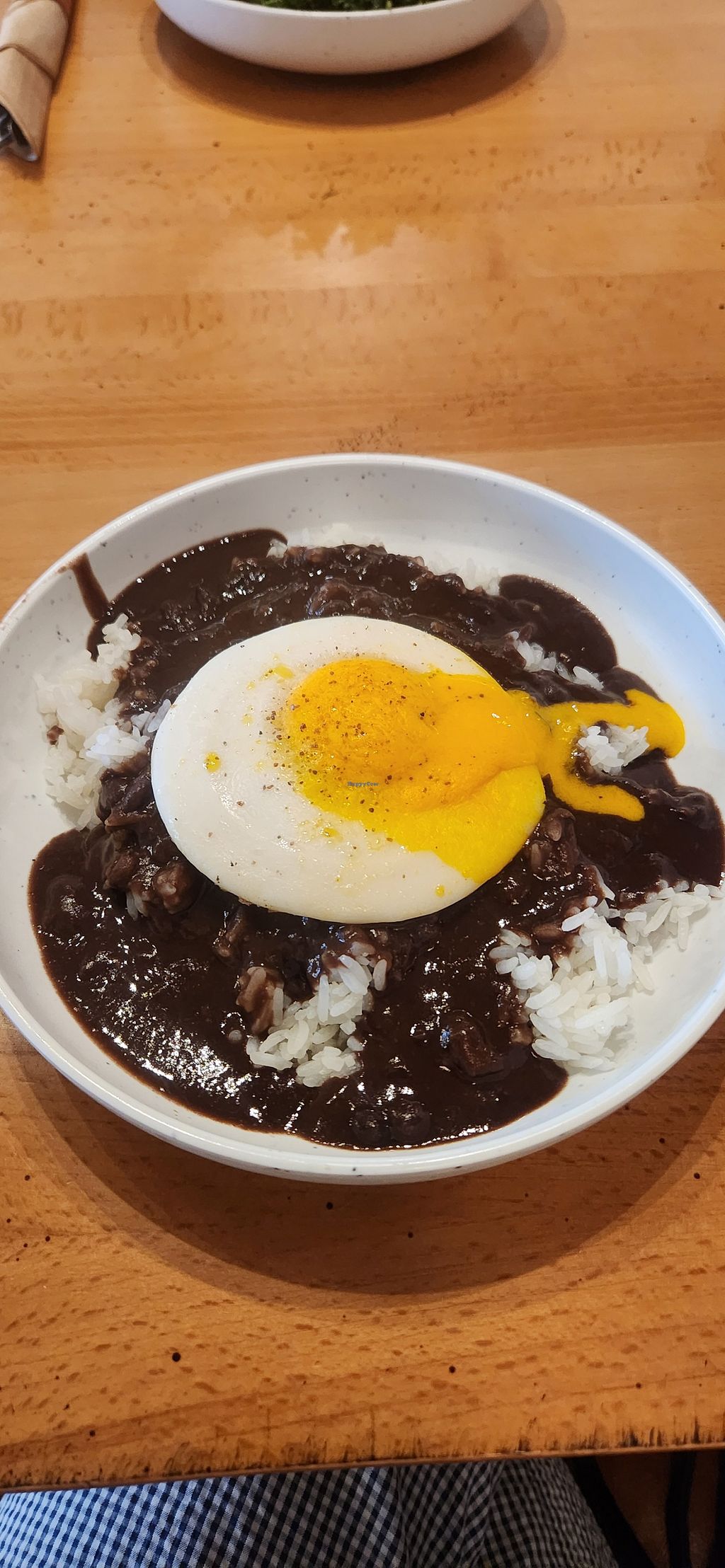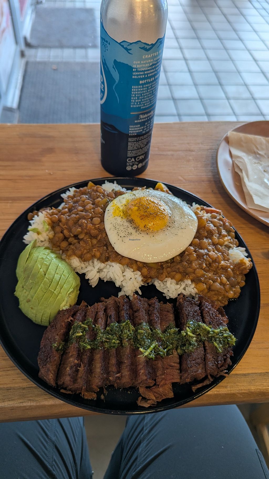 The protein plate has a vegan steak that is cooked really nicely with a good flavor. The sauce on top is heavy with cilantro so I had to scrape that off because cilantro tastes like soap to me. Then the side is a heap of rice covered in lentils and a vegan egg on top. That was really tasty and filling and a nice pairing with the processed "meat". It was all freshly made and is well seasoned. The vegan egg is really nice too because it is just like a regular sunny side up egg without any of the animal abuse. It tastes good, has a perfect texture, and an egg flavor that isn't overwhelming at all.