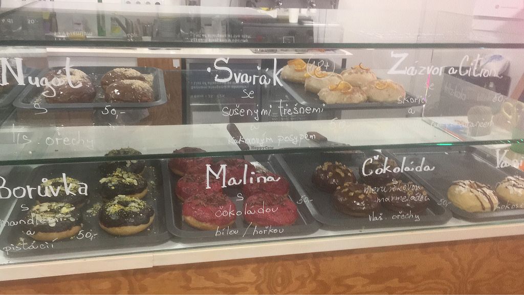 I found this bakery/coffee shop completely by accident but am very glad that I did! It offers the largest selection of vegan donuts which I have seen in this region, which are large and clearly fresh; I got one to take away (55Kč with box) and it was still very soft two hours later. There are also vegan cheesecakes and chocolate cakes, hot and cold drinks, and it looked like there had been more items available earlier in the day, as one counter had been cleaned and emptied by 5pm. There is a large seating area and the staff seemed friendly, but working guests should no that there is a no-wifi policy.