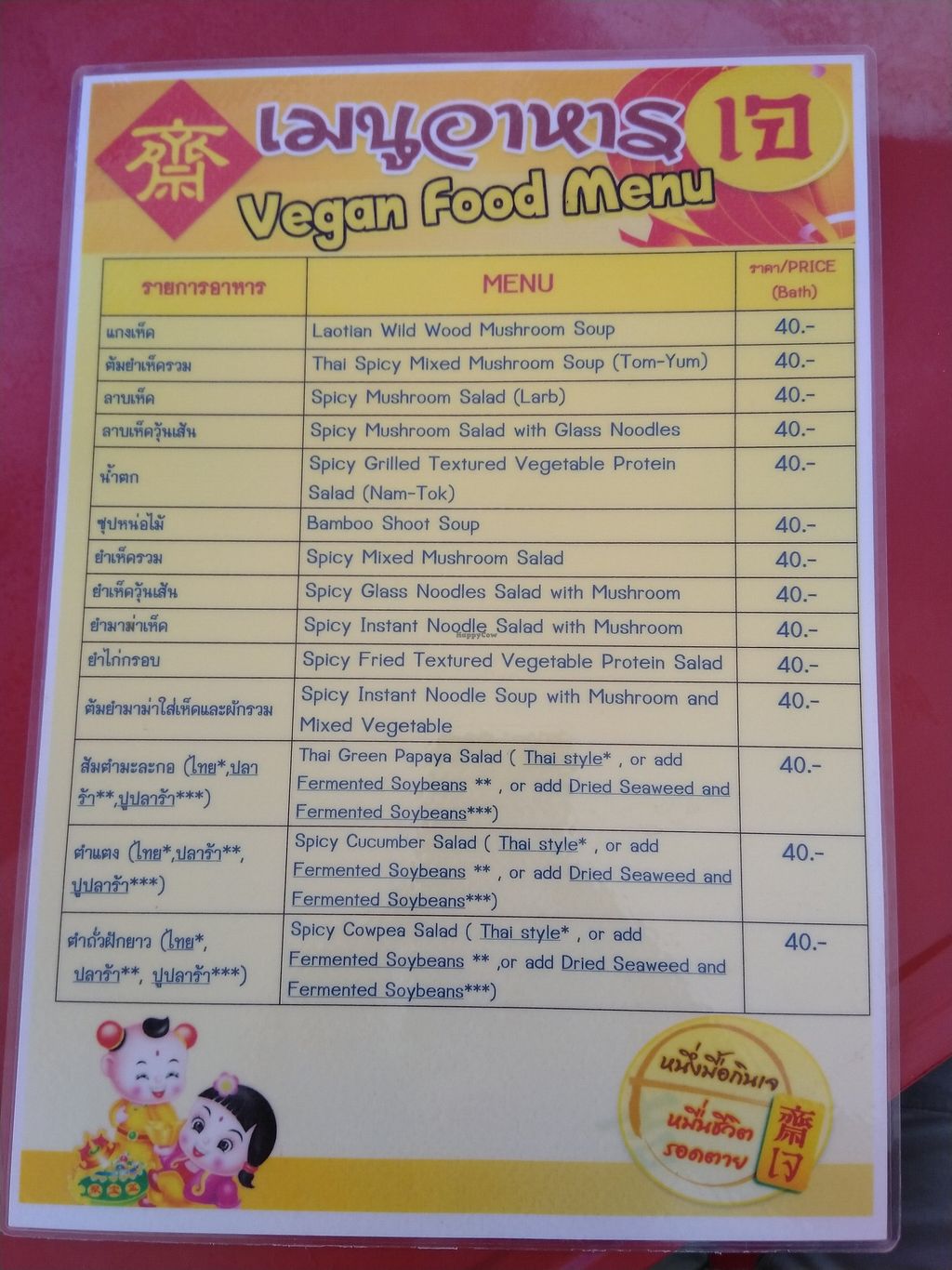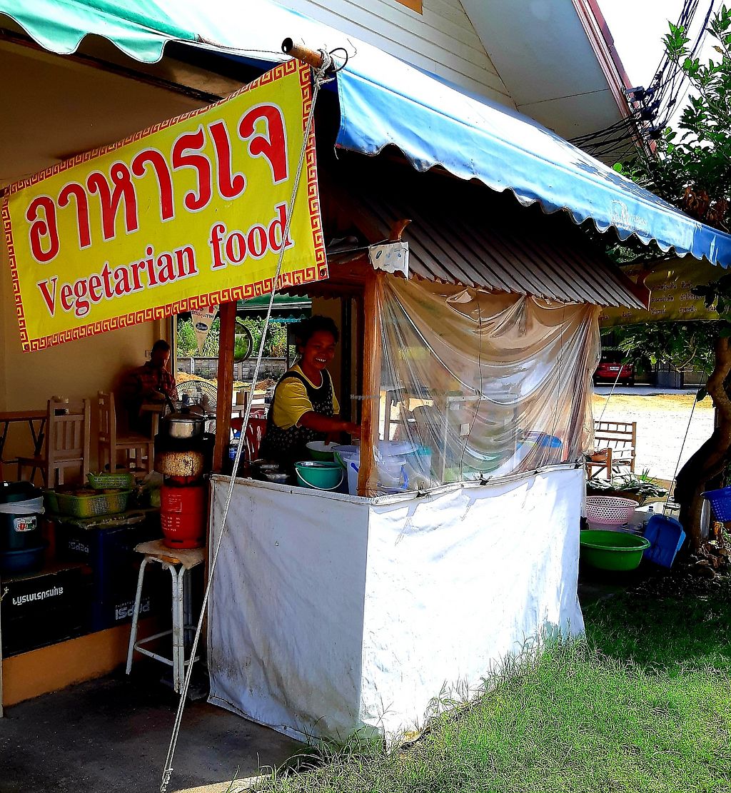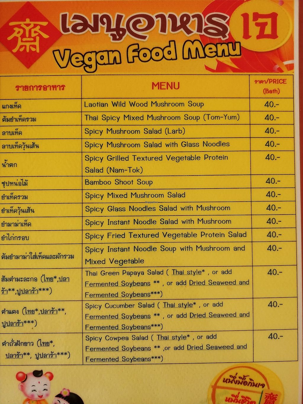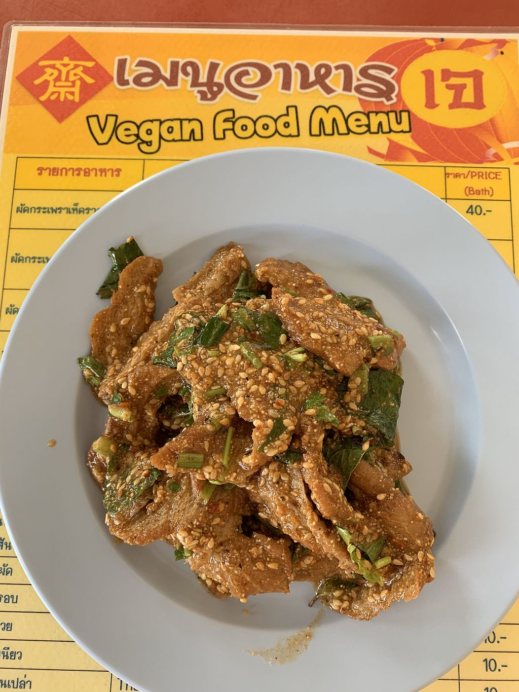 Although the sign says „vegetarian food“ it is all vegan. We went there twice because the food was delicious and the owner is a lovely woman. She speaks little english, but as she has a thai-english menu, communication is easy. Portions are a bit small, but as every dish is just 40 Baht there is nothing at all to complain. We always shared 3 dishes between the two of us. Everything we had was very tasty. Our favourite dish was the steamed rice with stir-fried spicy vegetable protein!