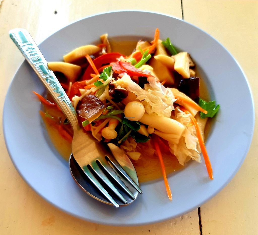 Read moreWe ordered the spicy Thai mushroom salad, fried rice and fried meat substitute strings. Very good. Really inexpensive and you get a waterbottle for free.