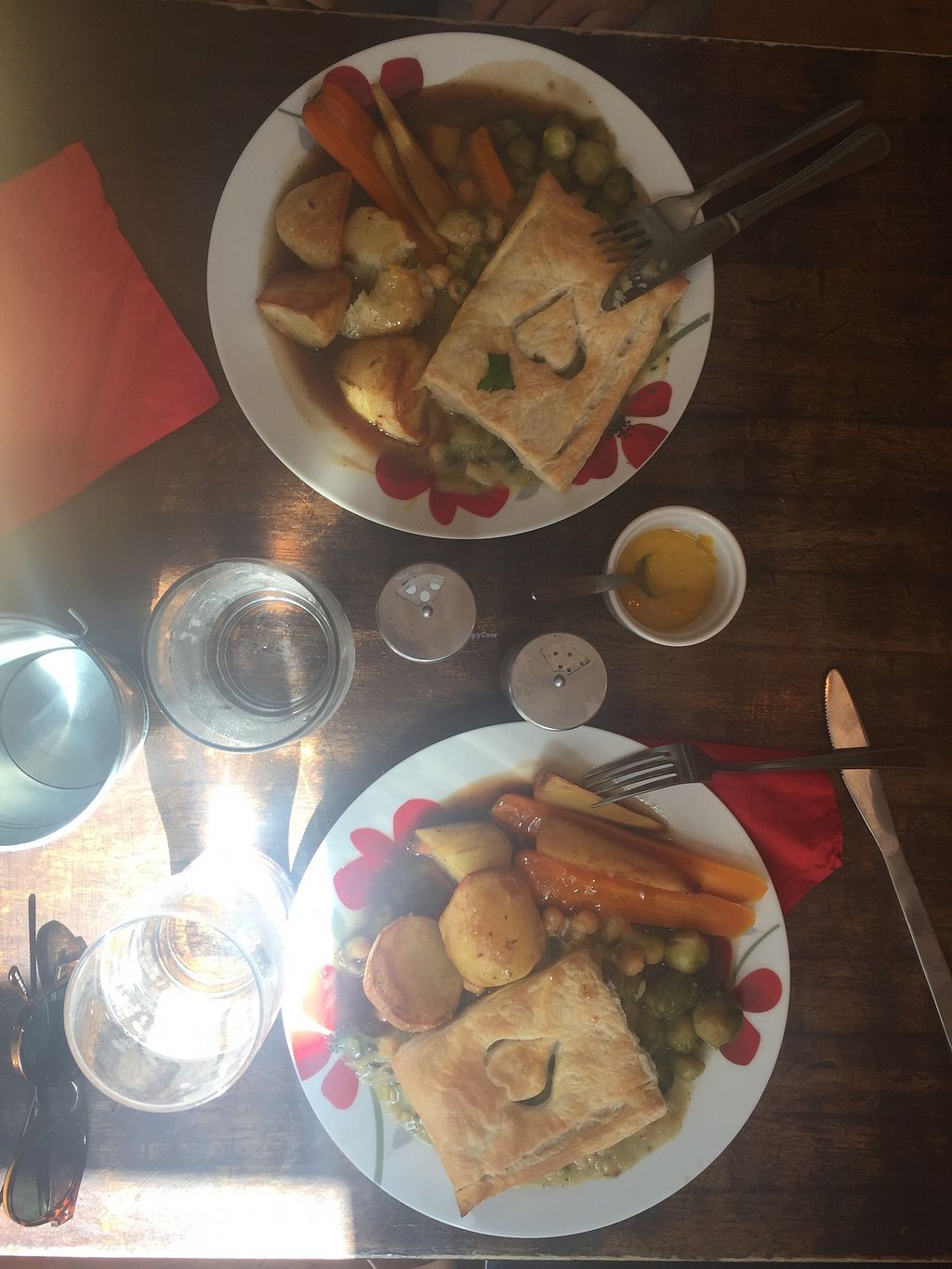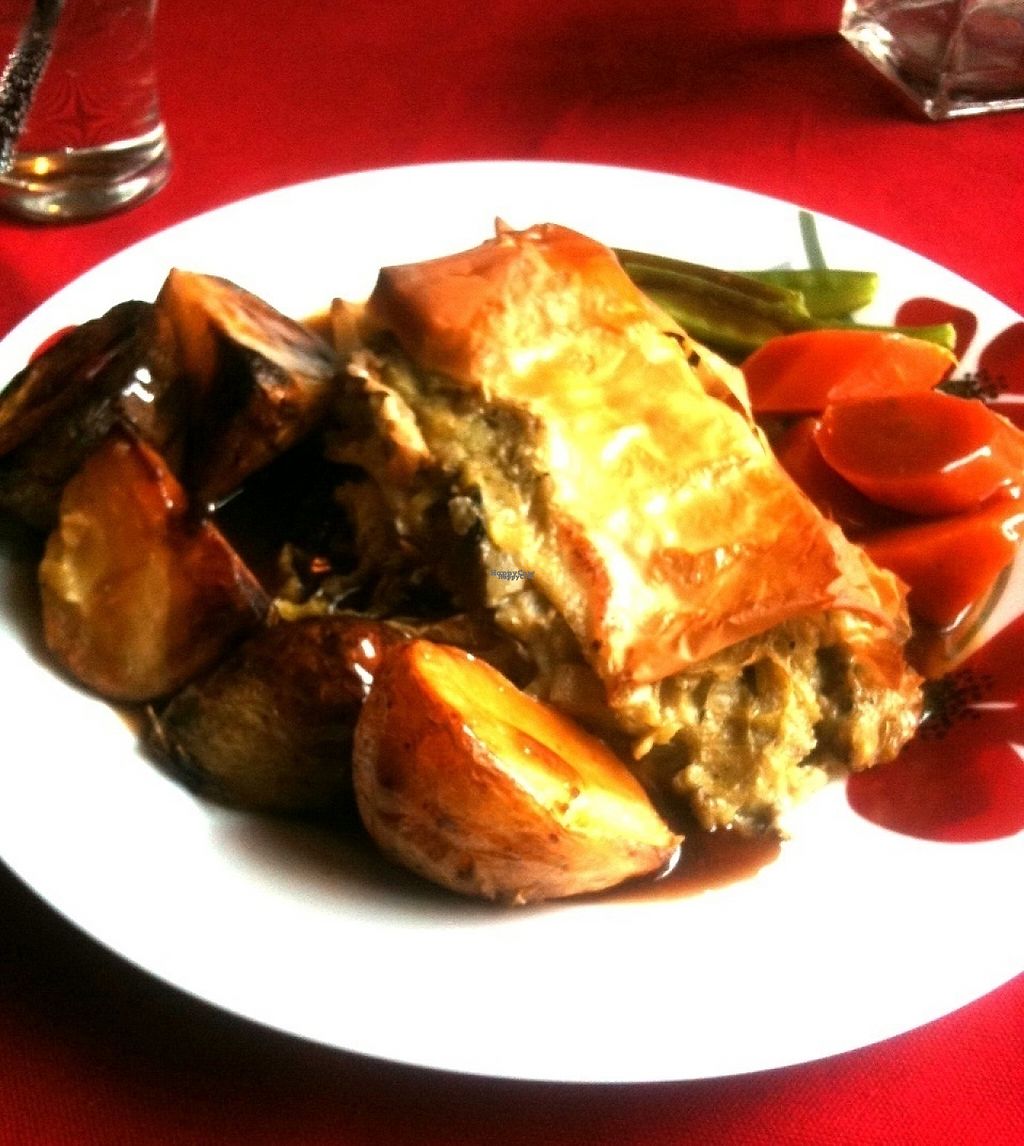 Sunday Roast, cheesy leek and mushroom parcel with Carrot, mangtout an…