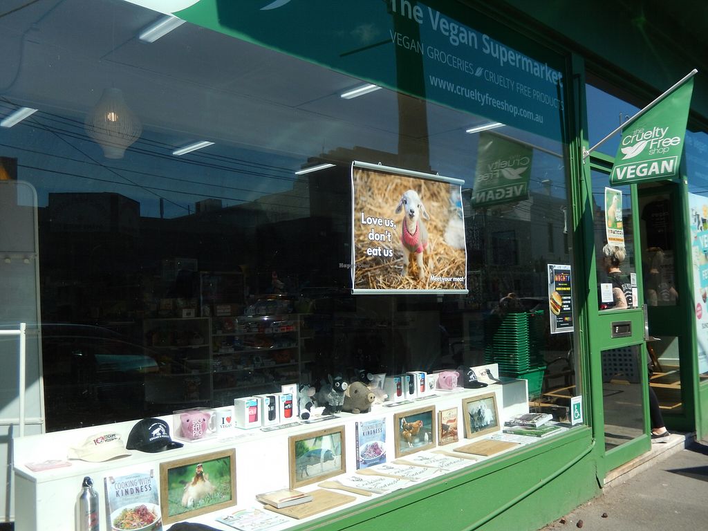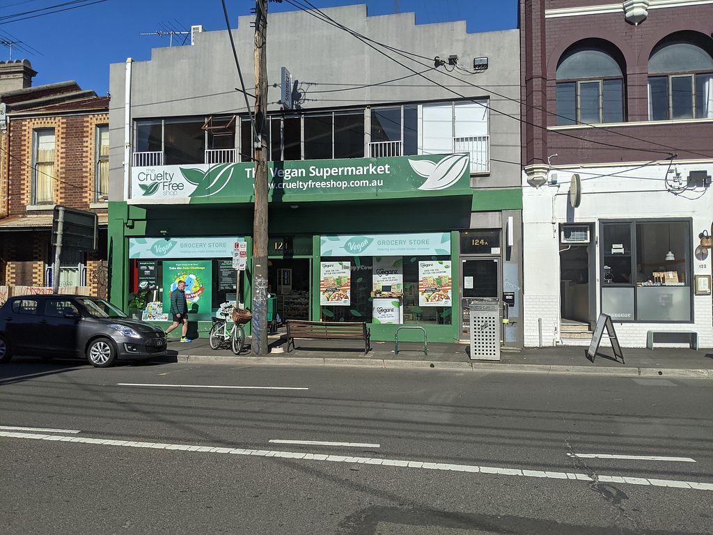 Vegan store with several outlets and an online store. Stocks a wide range of products, including faux meat, vegan cheese, snacks, confectionery, drinks, shoes, handbags, jackets, belts, t-shirts and wallets. Moved back to Johnson St after refurbishment, Mar 2019. Instagram: @vegangrocerystoreau. Previously named The Cruelty Free Shop. Reported closed June 2023.
