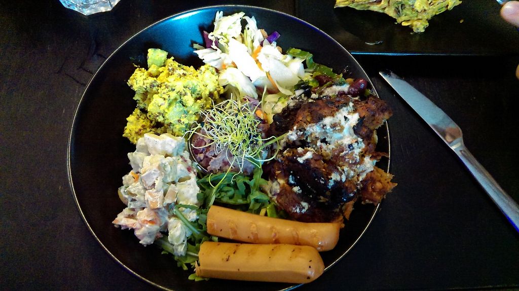 We ate here for breakfast and lunch. At breakfast, we had the chickpea omelette and peanut butter pancakes. The omelette was crispy on the outside and gooey on the inside. Really nice. The pancakes didn't really work. They weren't the right texture (more like a crumbly cake and a little dry). The lunch menu was excellent. The bean paste in the tacos was magical, the burger was super delicious with the tofu egg and side of coleslaw and the Estonian potato salad had a lot going on with the apple and small sausage (ham-like) pieces. We loved it.