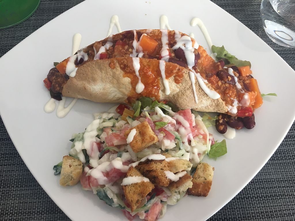 the food in this restaurant is all home made and sooo tasty (although my friend chose the chilli sin carne which was flavourful but not at all spicy). The portions are really generous and even though I shared my starter (olive and sun dried tomato hummus) I still didn’t have space for dessert after my tofu burger)! .The atmosphere is calm and the staff friendly and relaxed. I did taste a dessert (couldn’t resist!) of coffee 'cheesecake', sublime. I love visiting Loulé, and now I even more reason to go.