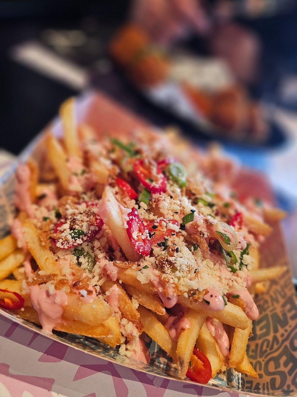 Had the mix fizz and chips which is a mix of fries, sweetpotato fries, seafood mockmeats and a garlic based sauce. None of it had much flavour except for the overbearing heavy garlic sauce that made it sit like a clump in my stomach for hours after. I do not recommend that menu item. Also a very tiny portion for 18€