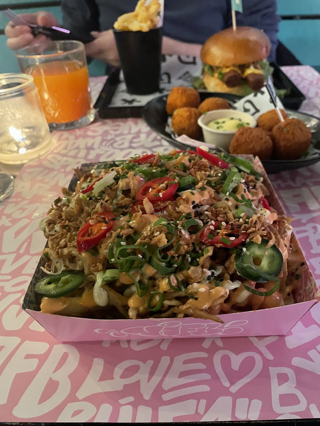 So many different choices! The chick'n better balls were incredible! Good burgers loaded fries etc too. Great vibe and music