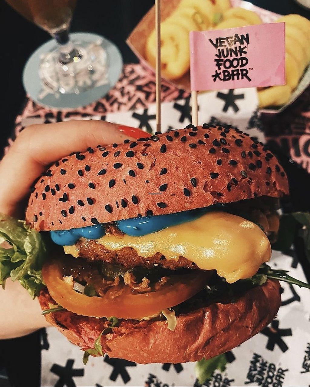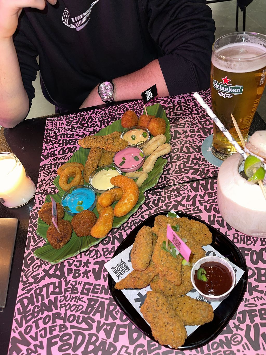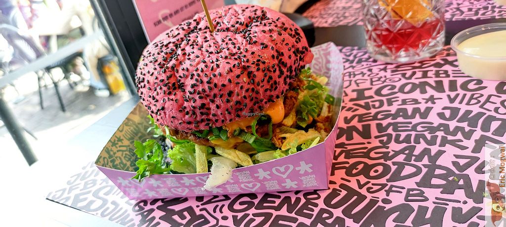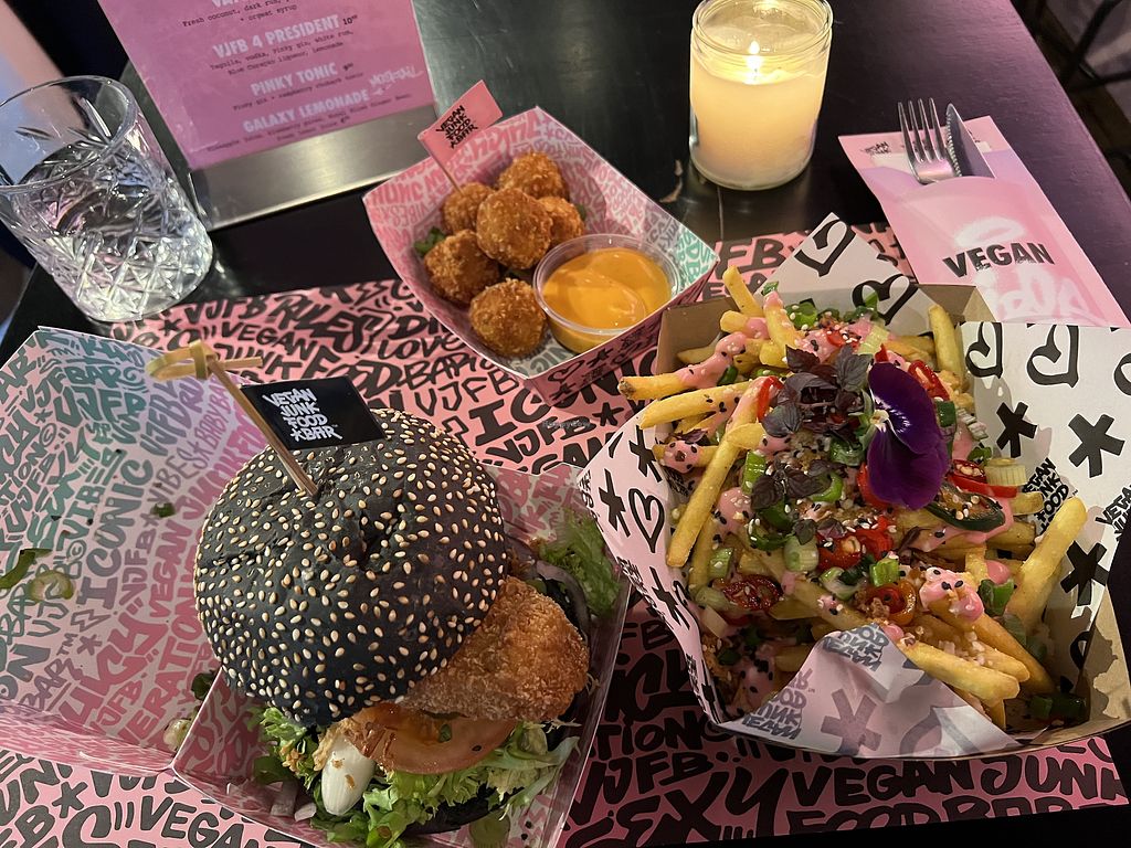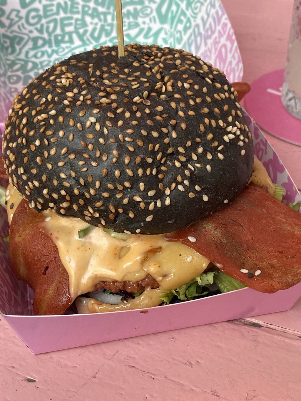 Black and pink bun burger, asian peanut butter balls, vegan wings (so …