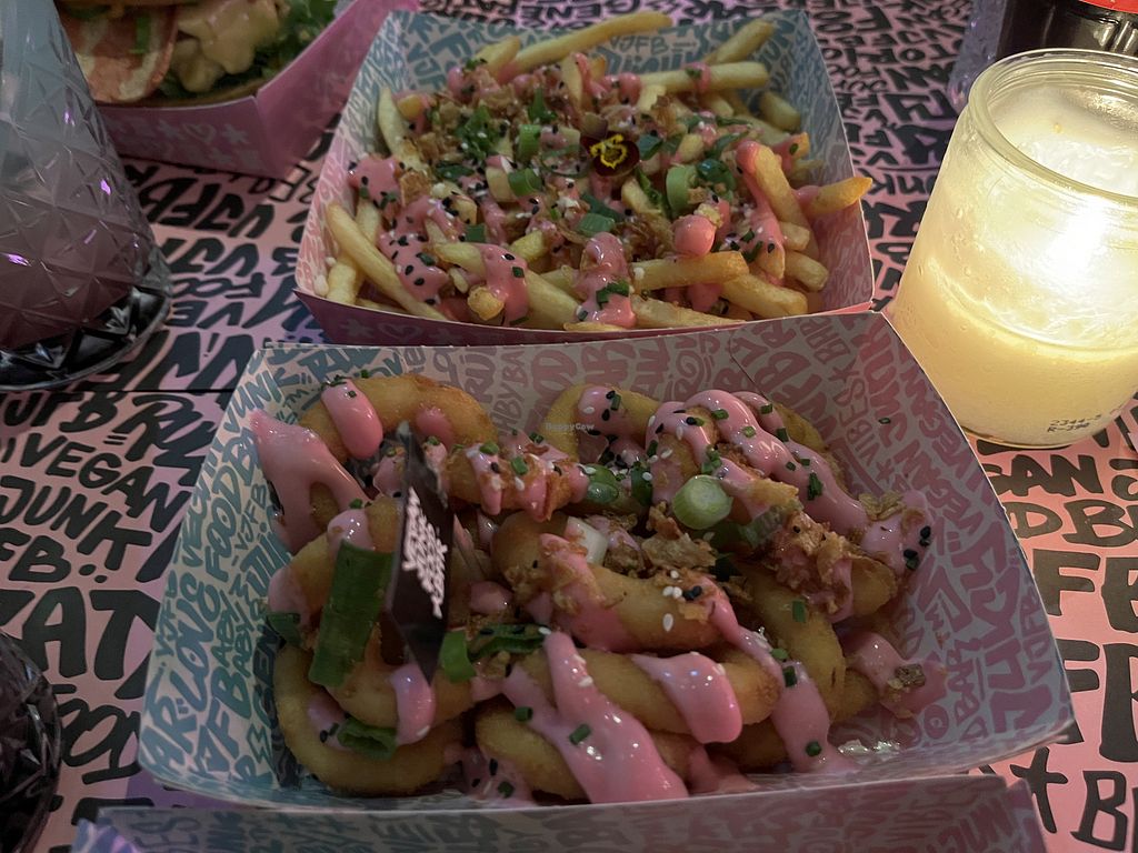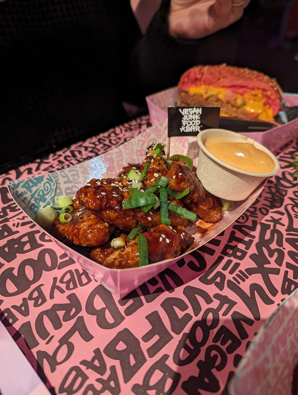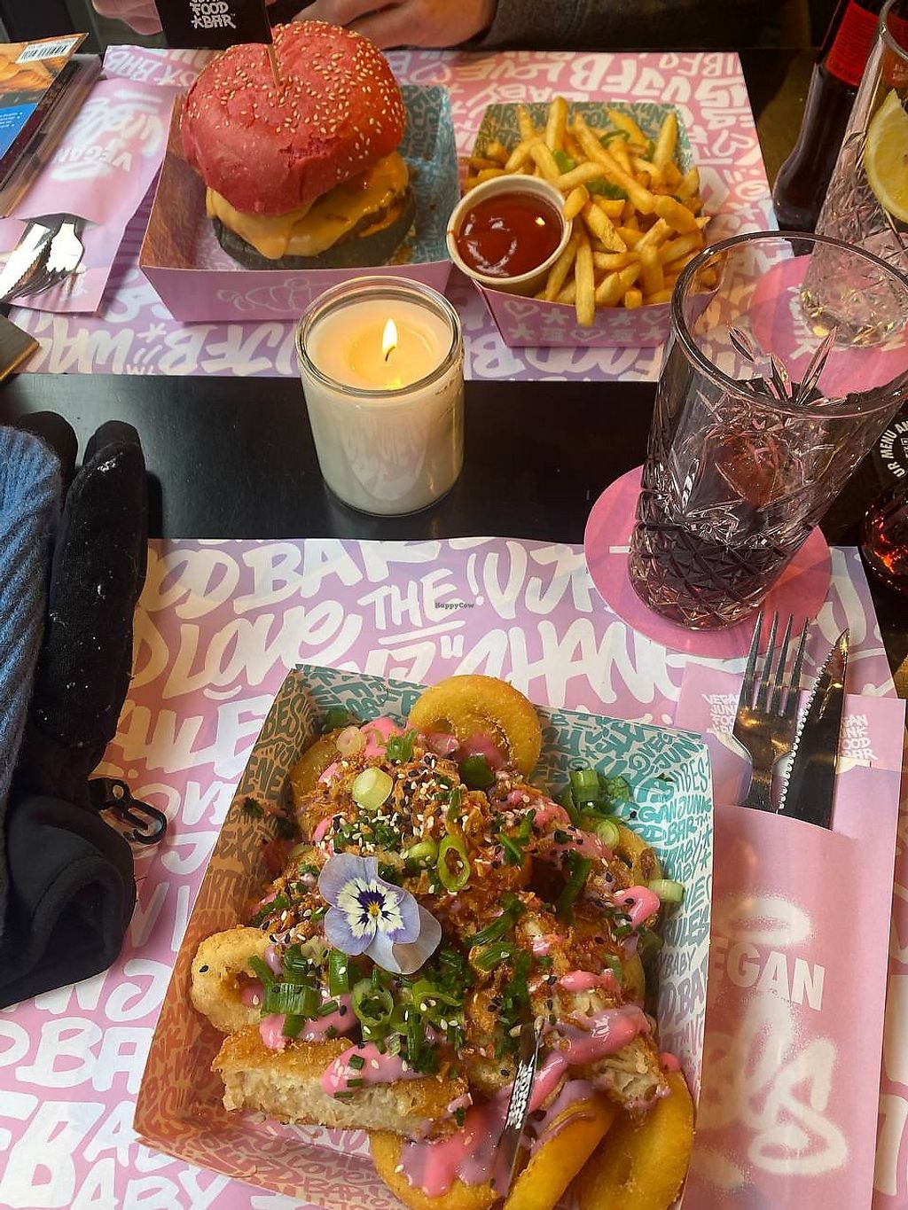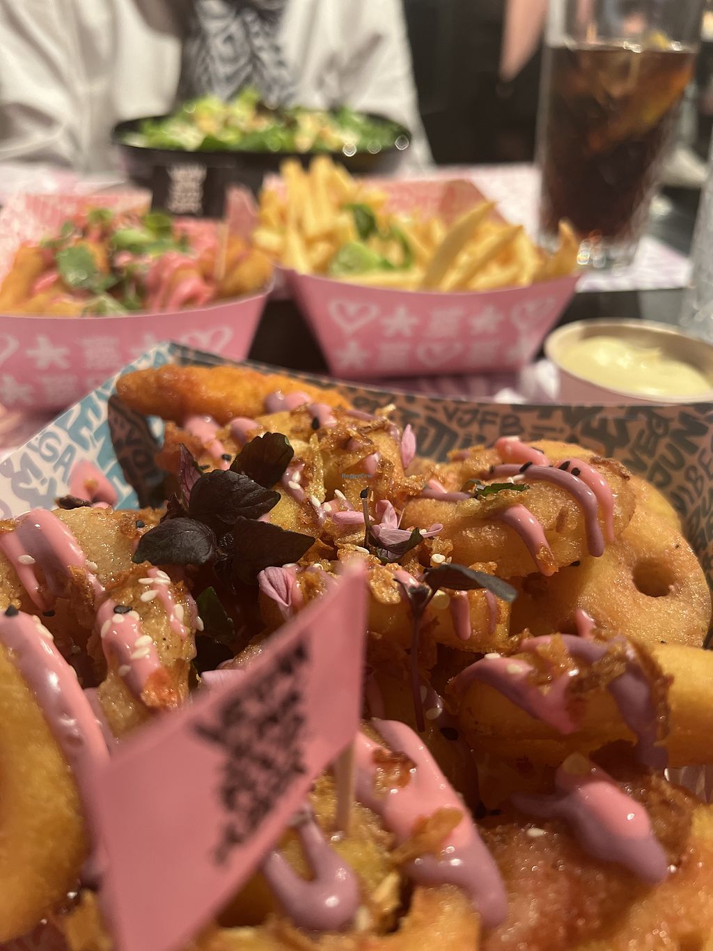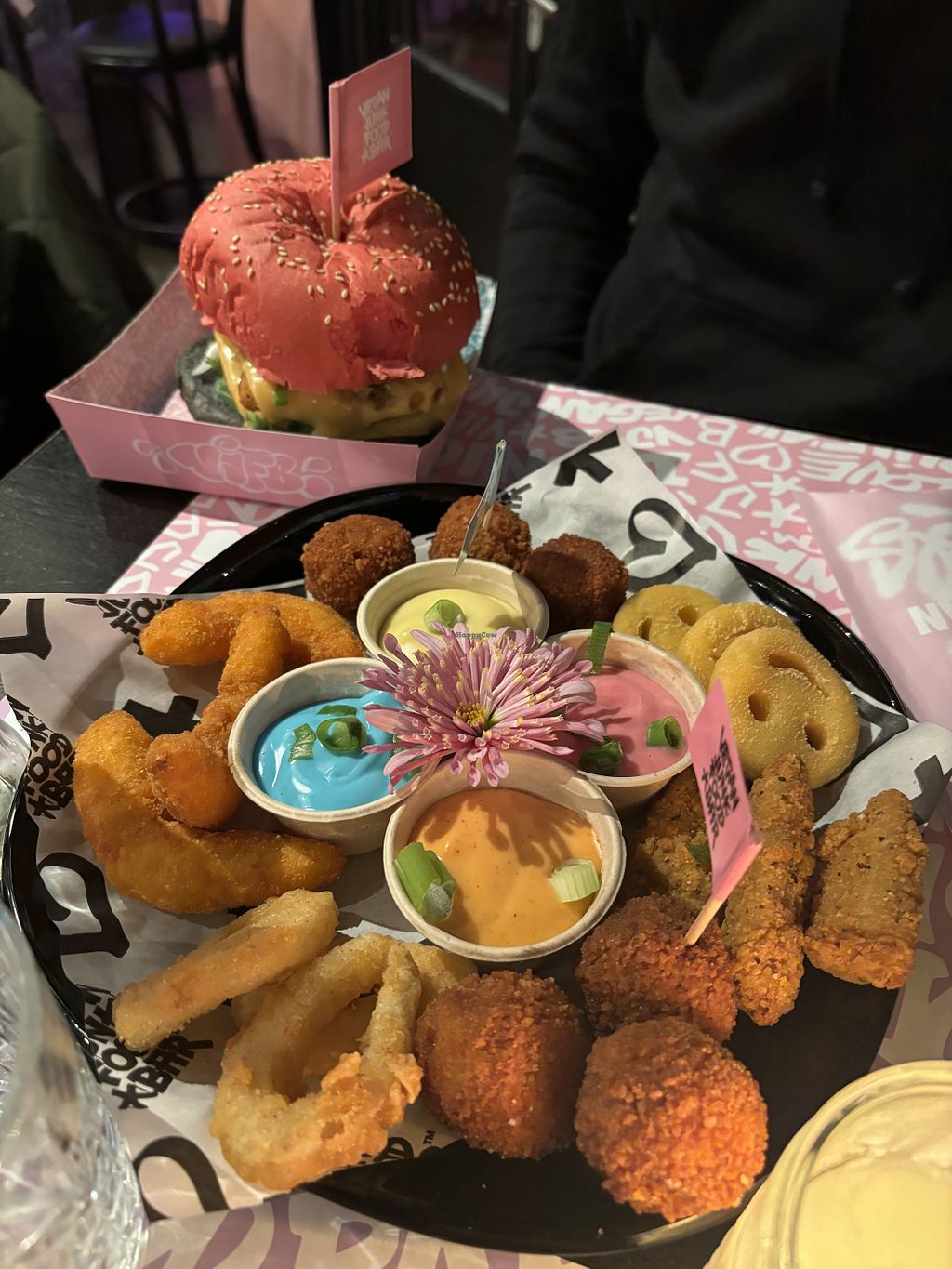 The pink garlic mayo on the onion rings - delicious #Veganuary