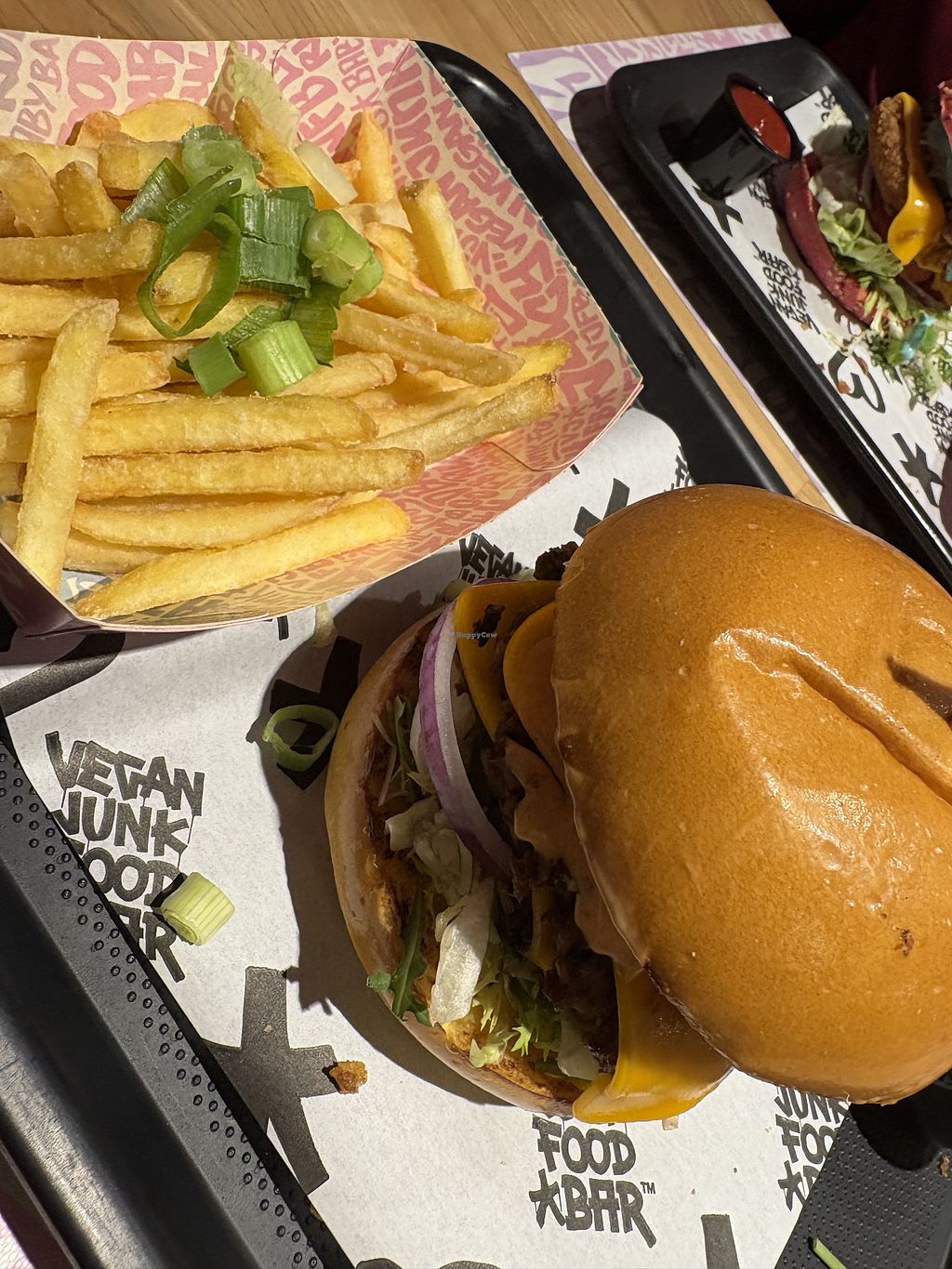VJFB Cruelty Free Burger: "beeef" on a black/pink bun, cheeze, lettuce…