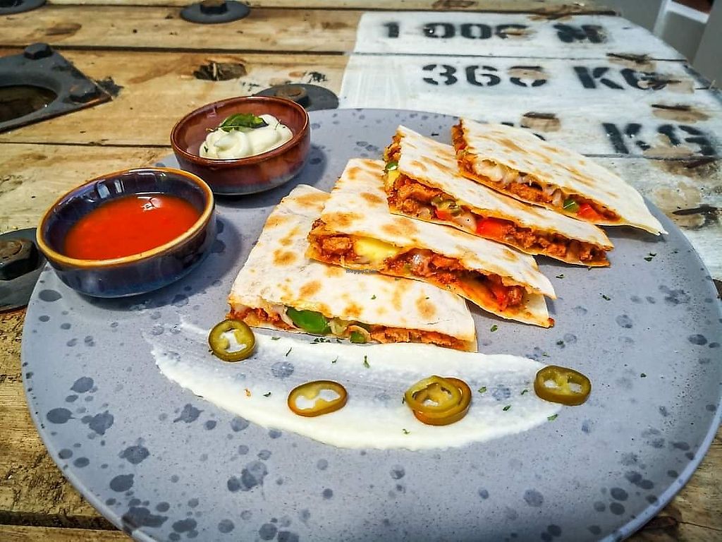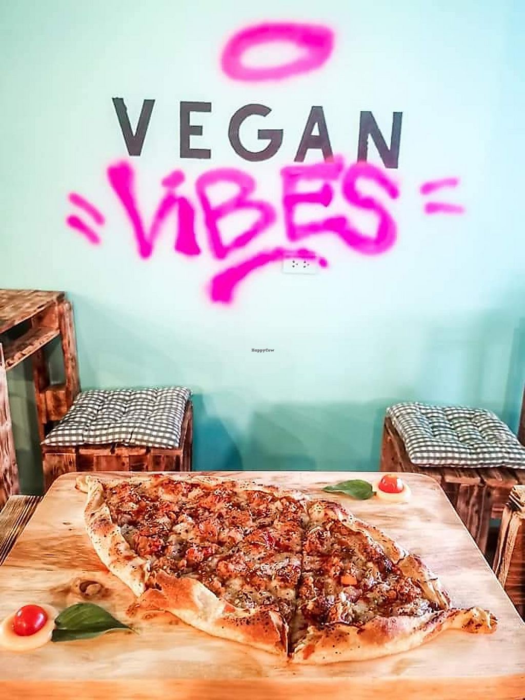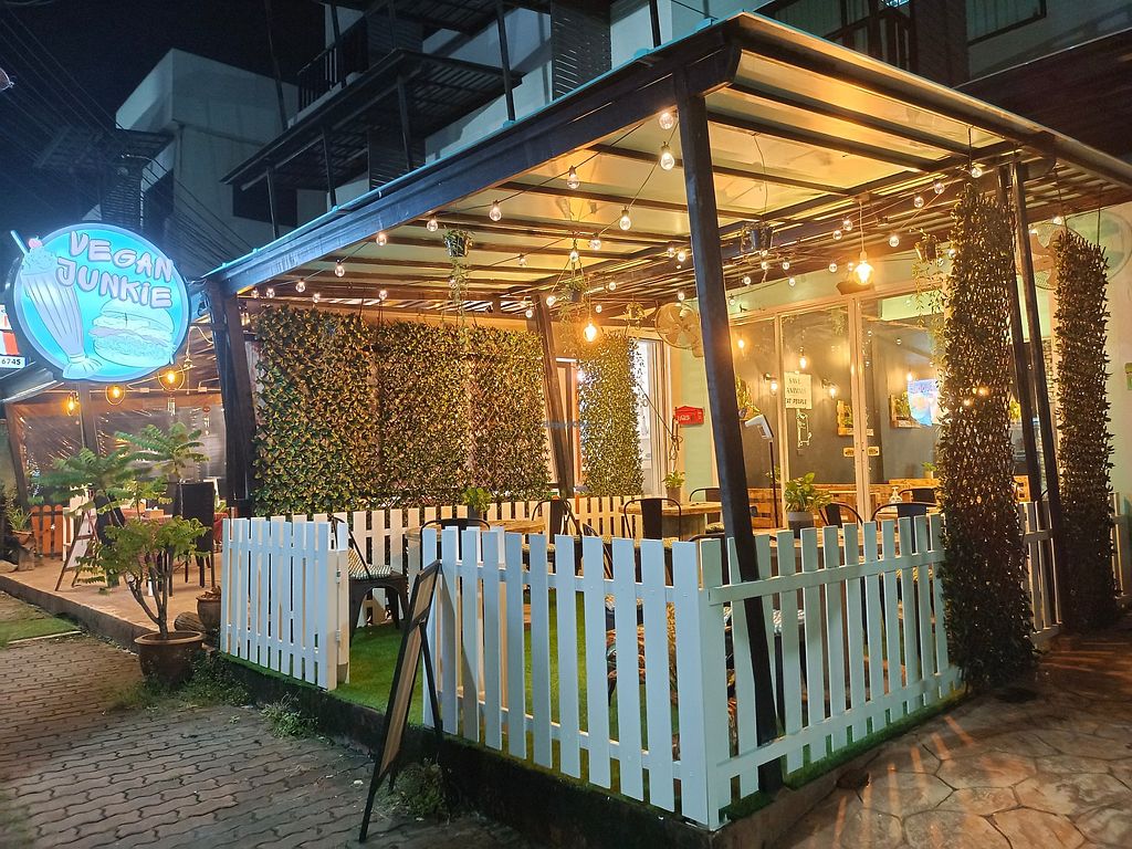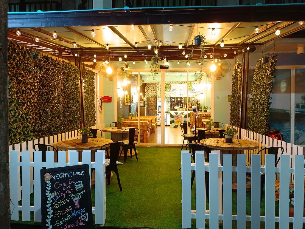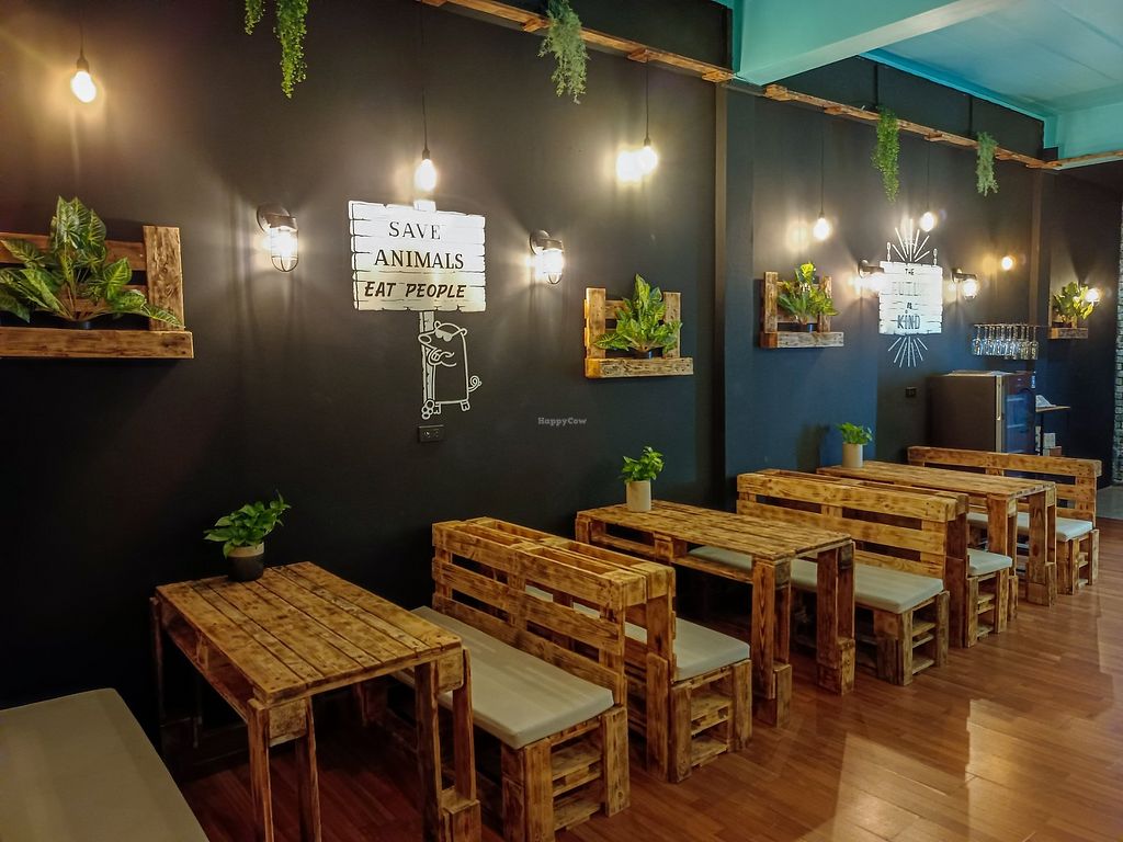 Inside Vegan Junkie. The furniture is handmade from recycled pallet wo…
