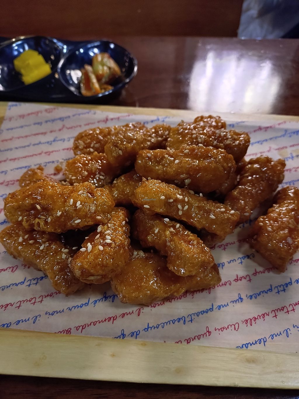 I tried the spicy chicken, which had such a nice consistency but unfortunately weren't spicy at all....i asked them for some spice and they gave me gochujang (which was a bit disappointing). Nevertheless they tasted good. Also tried the japchae which were tasty.