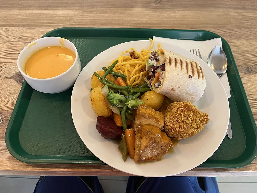 I ate here around 4-5pm, the choice was kinda small and the food was a bit cold, but it was still good.