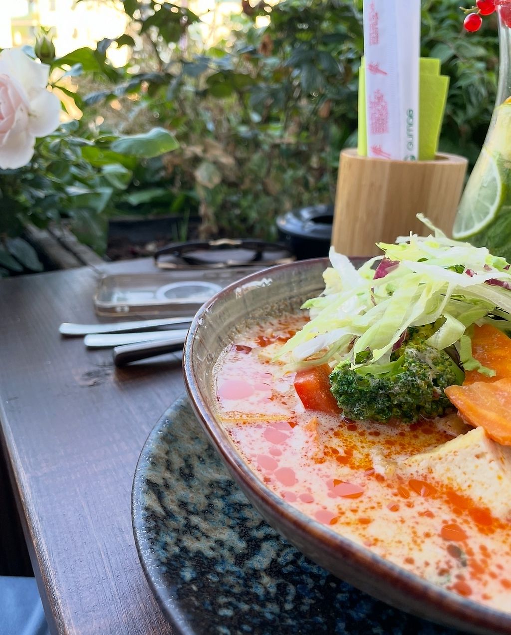 Sehr leckeres veganes Essen, ansprechend serviert von supernetter Bedienung. Wir haben bei schönem Wetter draußen gegessen, auch hier war es gemütlich.