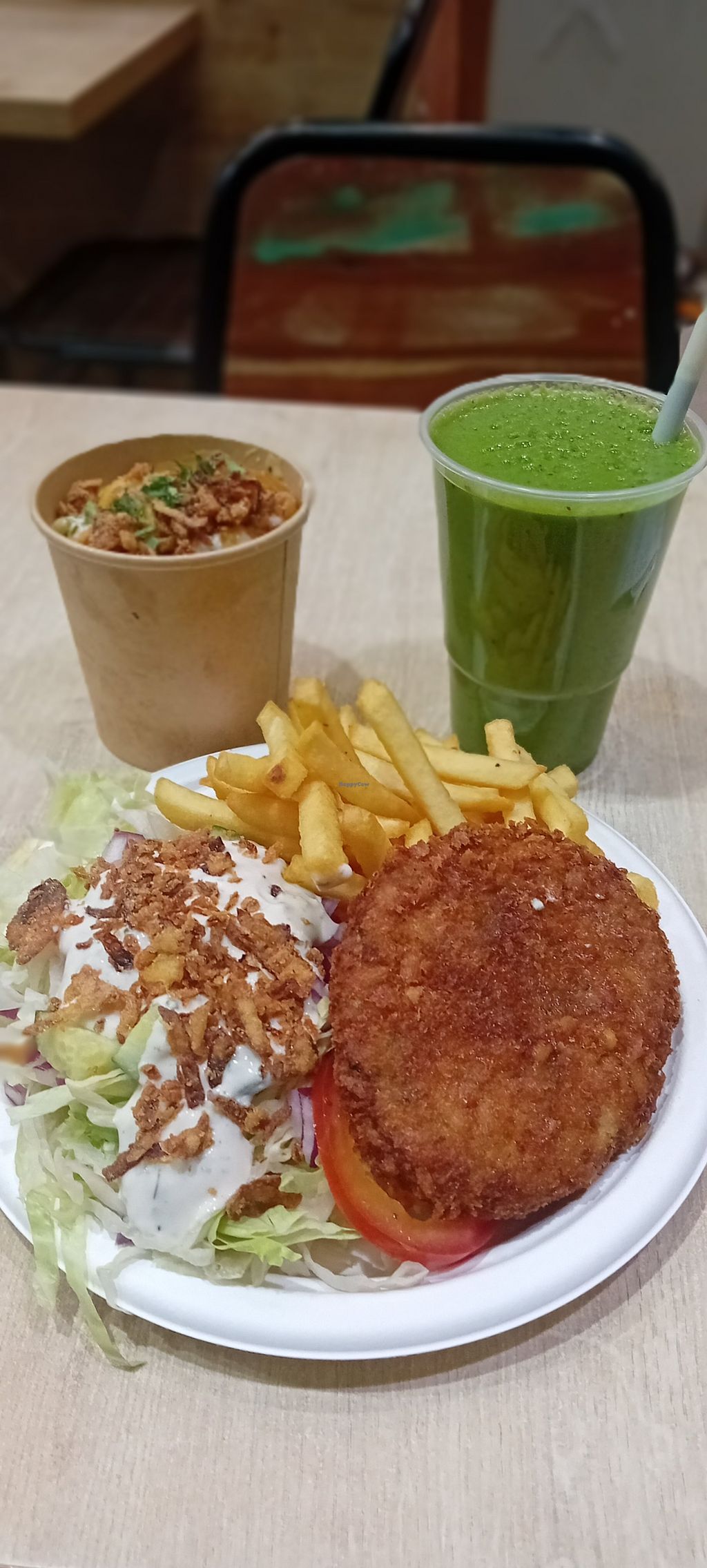 Vegan Chicken plate, Mac'n cheese and green smoothie