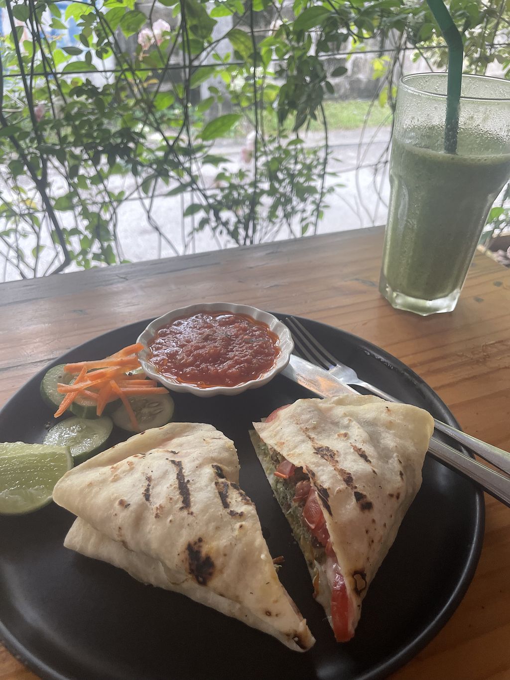 I went and ordered the pesto tempeh quesadilla, but they were out of tempeh. So went with the black bean quesadilla and it was ok and the portion was small. There is a cute cat that hangs in and around the restaurant.