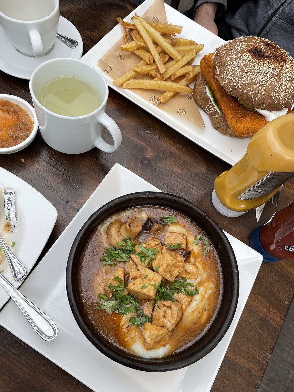 I went with my partner and we shared the Crispy Burger, the Dark Burger, the cheese and hotdog topped fries and 2 portions of the cheese and ham spring rolls. I didn't eat the bread of the burgers as everything was so huge and rich I wouldn't have been able to finish it all! The crispy Burger had great fried tofu, very flavoursome. The staff were really friendly and we are going to come back and get a (huge) cinnamon roll since they looked very good but we didn't have any space for dessert!